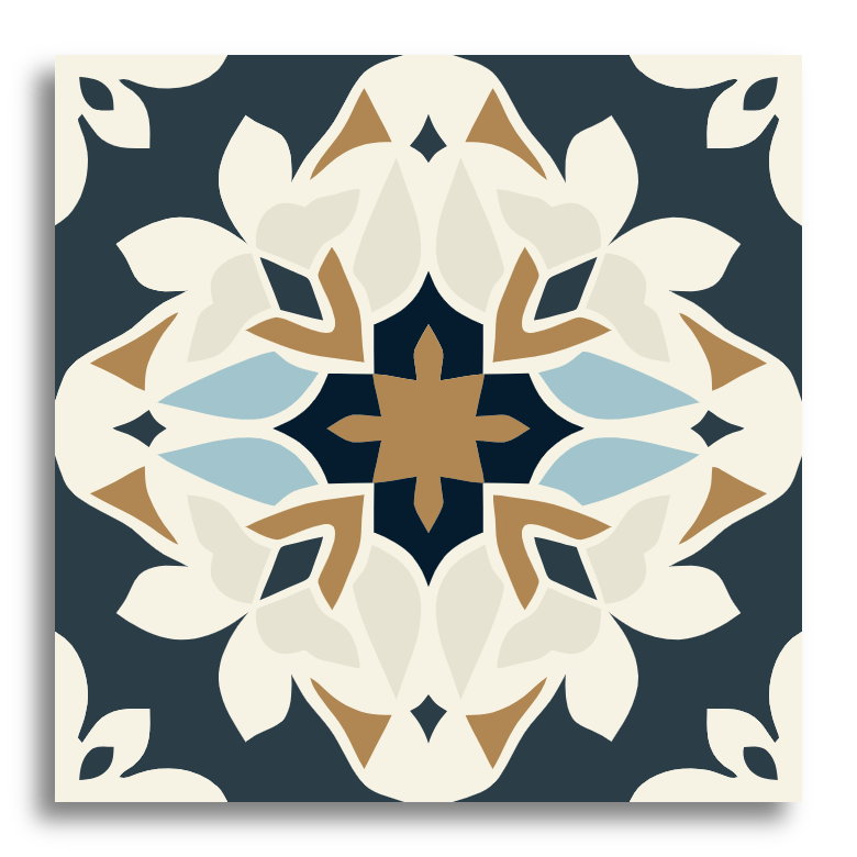 Ce carreau Décor présente un design symétrique inspiré de motifs floraux centré autour d'un motif en forme d'étoile. La palette de couleurs mélange élégamment des nuances de crème, de bleu clair, de marron et de gris foncé, lui conférant un charme vintage. Évoquant les carreaux traditionnels méditerranéens ou de style espagnol Décor, le motif complexe et équilibré de formes géométriques et d'éléments floraux capture la beauté intemporelle des carreaux encaustiques classiques.