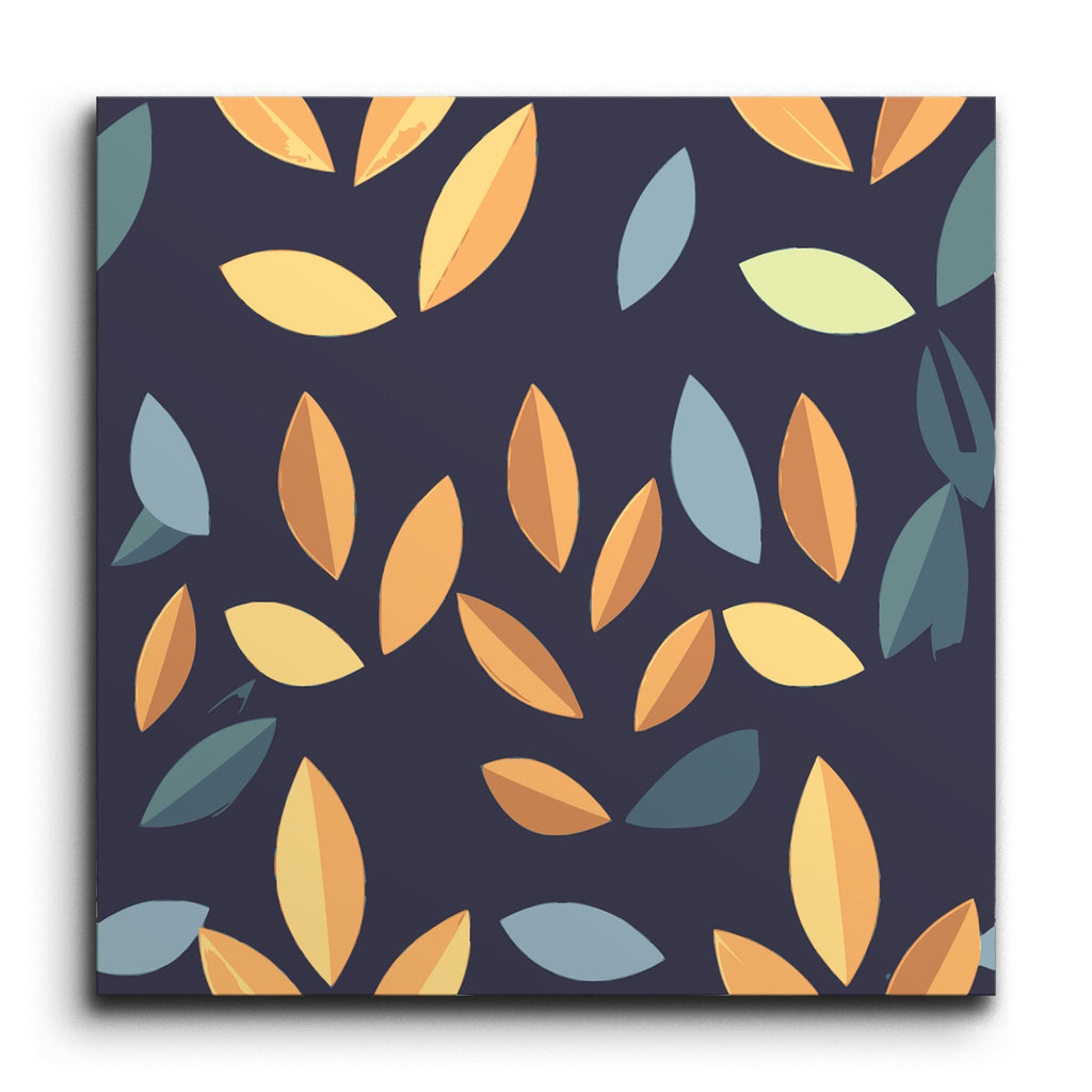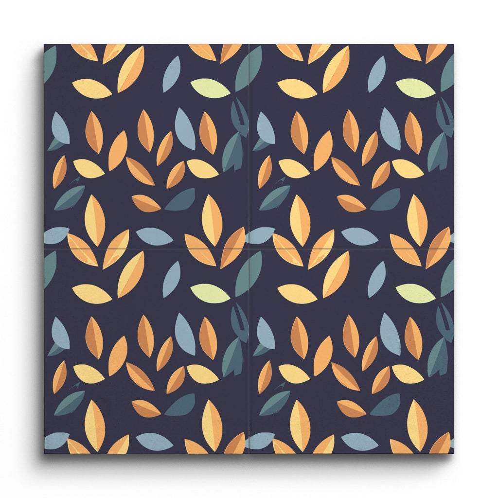 Diese Dekorfliese zeigt ein dynamisches geometrisches Muster, das mit stilisierten Blattformen verziert ist, die über die Oberfläche zu tanzen scheinen. Die lebendige Farbpalette kombiniert Orangetöne, Gelb, Türkis und Hellgrün, die alle vor einem tiefblauen Hintergrund gesetzt sind. Dies erzeugt einen auffälligen Kontrast, der das Design zum Leben erweckt. Mit ihrer modernen und verspielten, aber dennoch strukturierten Ästhetik verleiht diese Fliese jedem Raum eine lebendige Note.