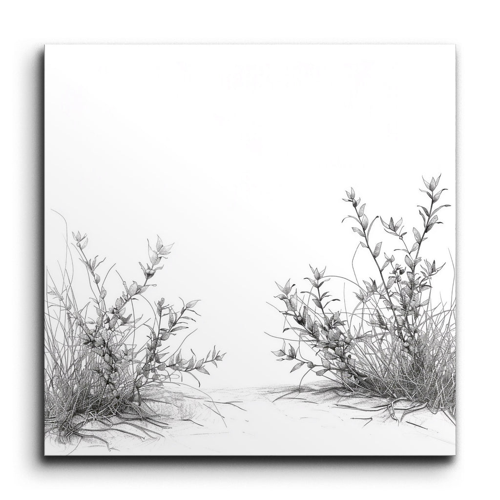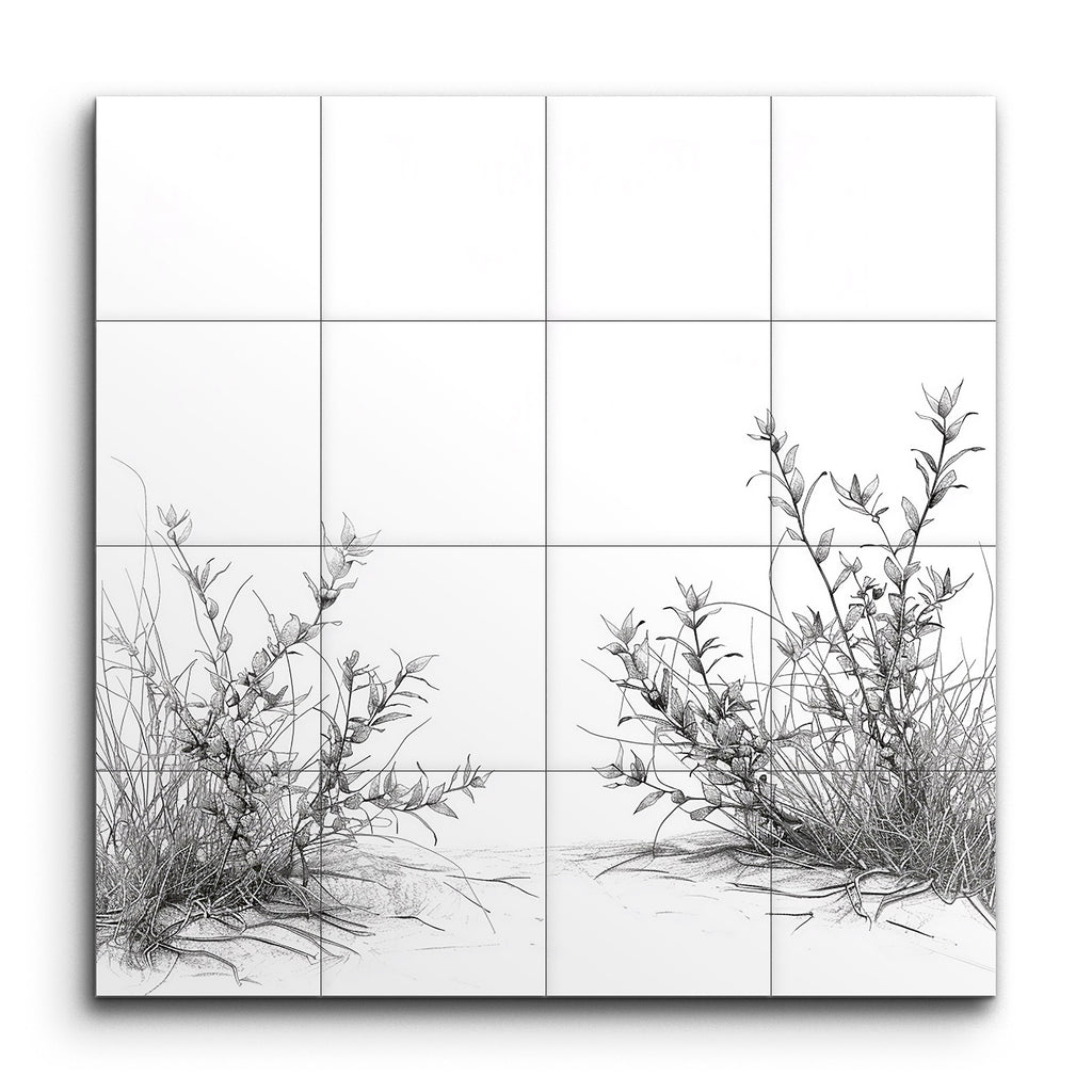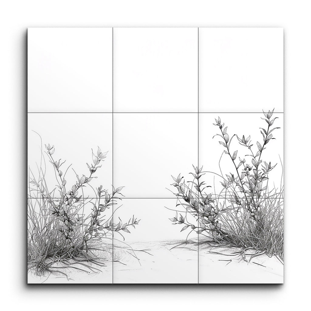 Verbessern Sie Ihren Raum mit diesem eleganten Fliesenbild, das eine minimalistische, monochromatische Darstellung von zwei Pflanzengruppen zeigt. Fein in zarten Linien ausgearbeitet, präsentiert jede Gruppe schlanke Stängel und verlängerte Blätter, die eine ausgewogene und symmetrische Komposition schaffen. Die subtile Schattierung und die präzise Linienführung verleihen den Pflanzen eine naturalistische, dreidimensionale Qualität, die Einfachheit und Eleganz betont. Perfekt, um jedem Ambiente einen Hauch von raffinierter, naturinspirierter Kunst zu verleihen.
