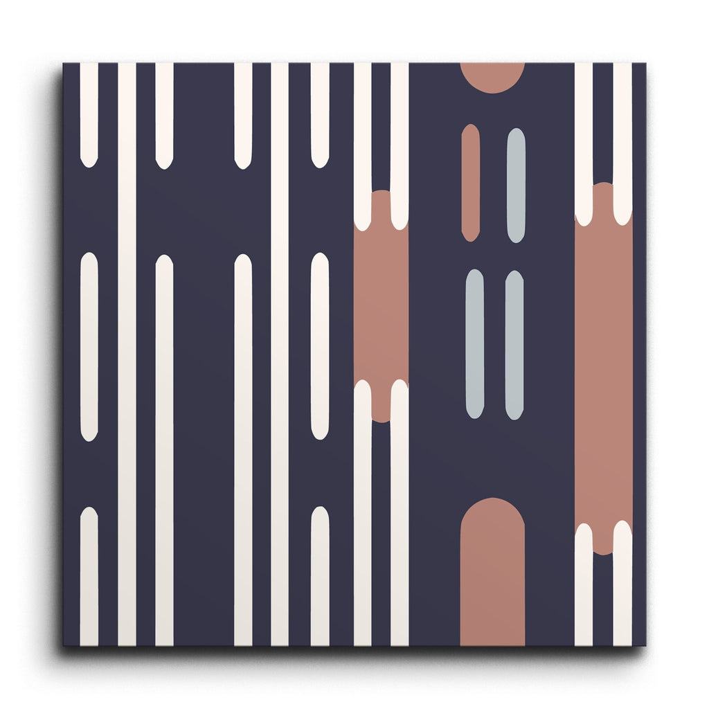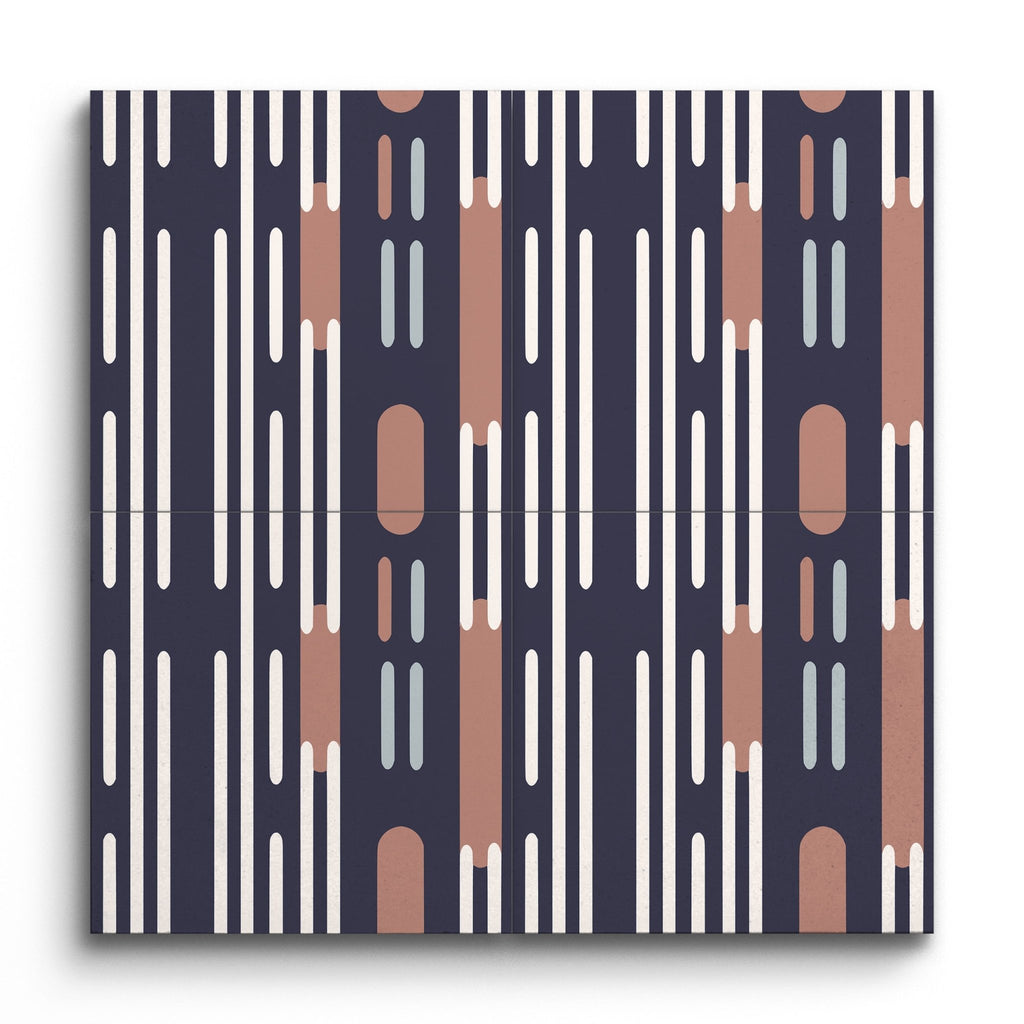 Diese Dekorfliese präsentiert ein fesselndes geometrisches Muster, das aus verlängerten vertikalen Formen und Linien besteht und einen rhythmischen und strukturierten visuellen Reiz bietet. Die harmonische Farbpalette kombiniert tiefes Marineblau mit sanftem Beige, gedämpftem Rosa und hellem Grau, was zu einer zeitgenössischen und ausgewogenen Ästhetik führt. Der Minimalismus des Designs wird durch seinen markanten Fokus auf Symmetrie ergänzt, was es zu einer eleganten Ergänzung für jeden Raum macht.