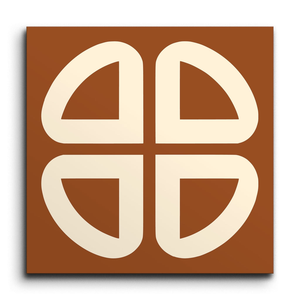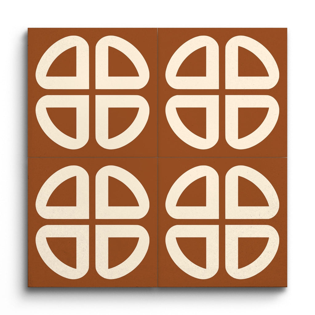 Diese Dekorfliese zeigt ein auffälliges Enkaustikmuster mit markanten geometrischen Formen, die ein harmonisches, symmetrisches kreuzartiges Motiv schaffen. Das Design kombiniert elegant vier cremefarbene Viertelkreise vor einem tiefbraunen Hintergrund und bietet eine Mischung aus traditioneller Kunstfertigkeit und modernem Flair. Die erdige Farbpalette verleiht Wärme und rustikalen Charme, was sie zu einer vielseitigen Wahl für jede Dekoreinrichtung macht.