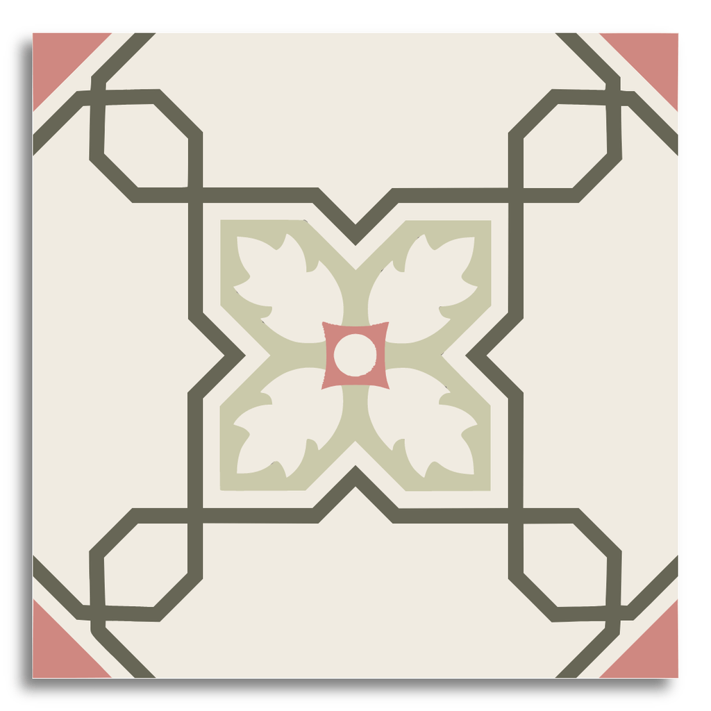 This decor tile showcases a harmonious blend of stylized leaves in a cross formation, set against a soothing palette of soft beige and gray. The symmetrical design is elegantly framed by geometric lines, forming a square border that adds a touch of structure. Accentuated by triangular shapes at the corners, the tile embodies the intricate charm characteristic of encaustic styles, offering a subtle yet sophisticated visual appeal.