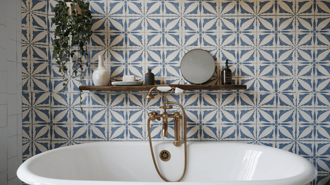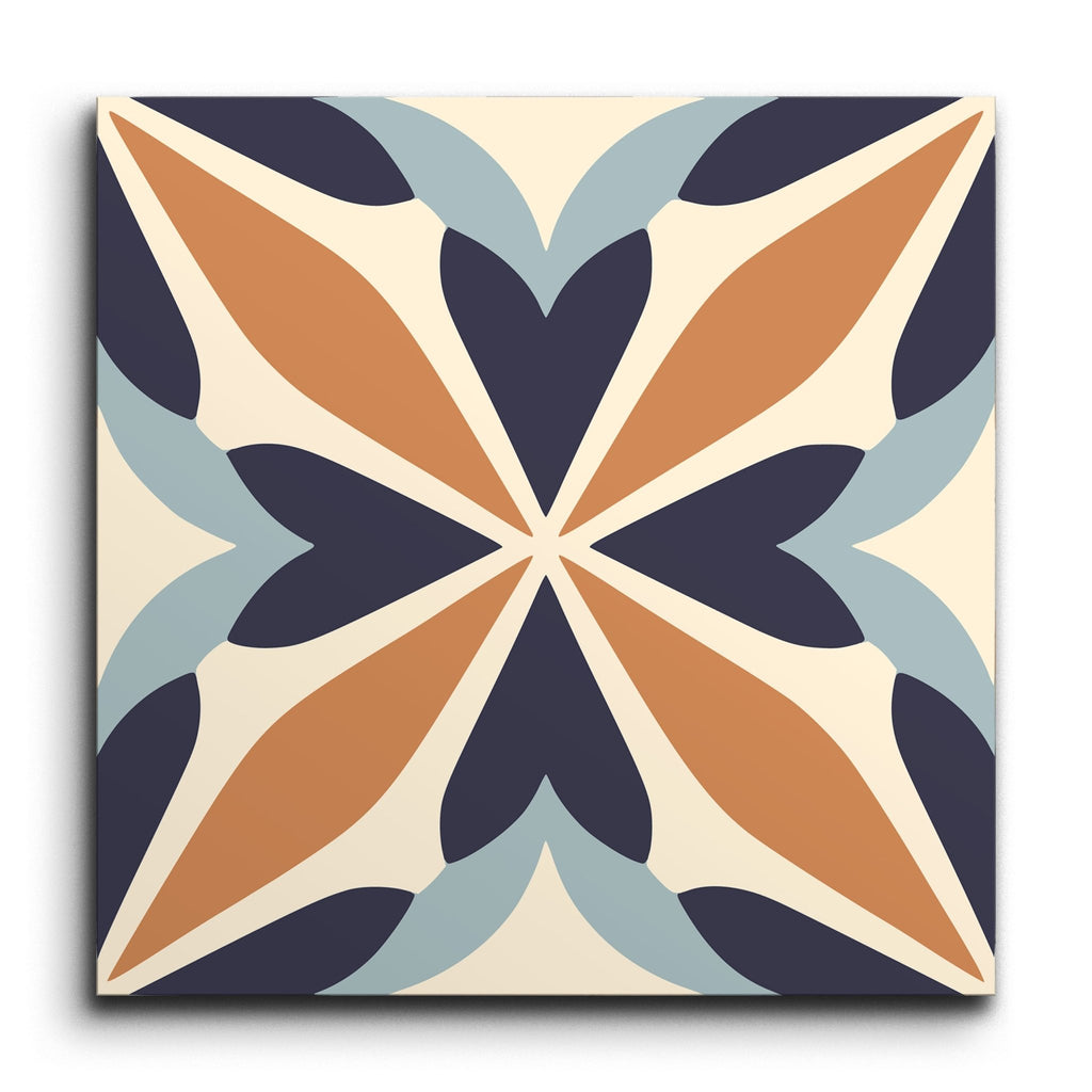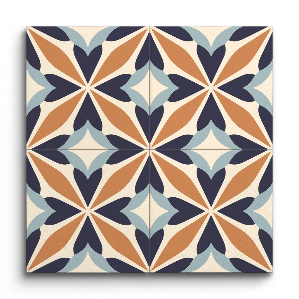 Diese Dekorfliese präsentiert ein faszinierendes, von Enkaustik inspiriertes Muster, das ein sternähnliches Motiv mit geometrischen Formen verbindet. Die erdigen Töne von Terrakotta, Marineblau und Hellblau heben sich von einem weichen Cremehintergrund ab und schaffen eine harmonische Farbmischung. Ihr Design balanciert mühelos klassischen Charme mit einem modernen Touch und bietet eine zeitlose Ästhetik, die zu einer Vielzahl von Einrichtungsstilen passt.
