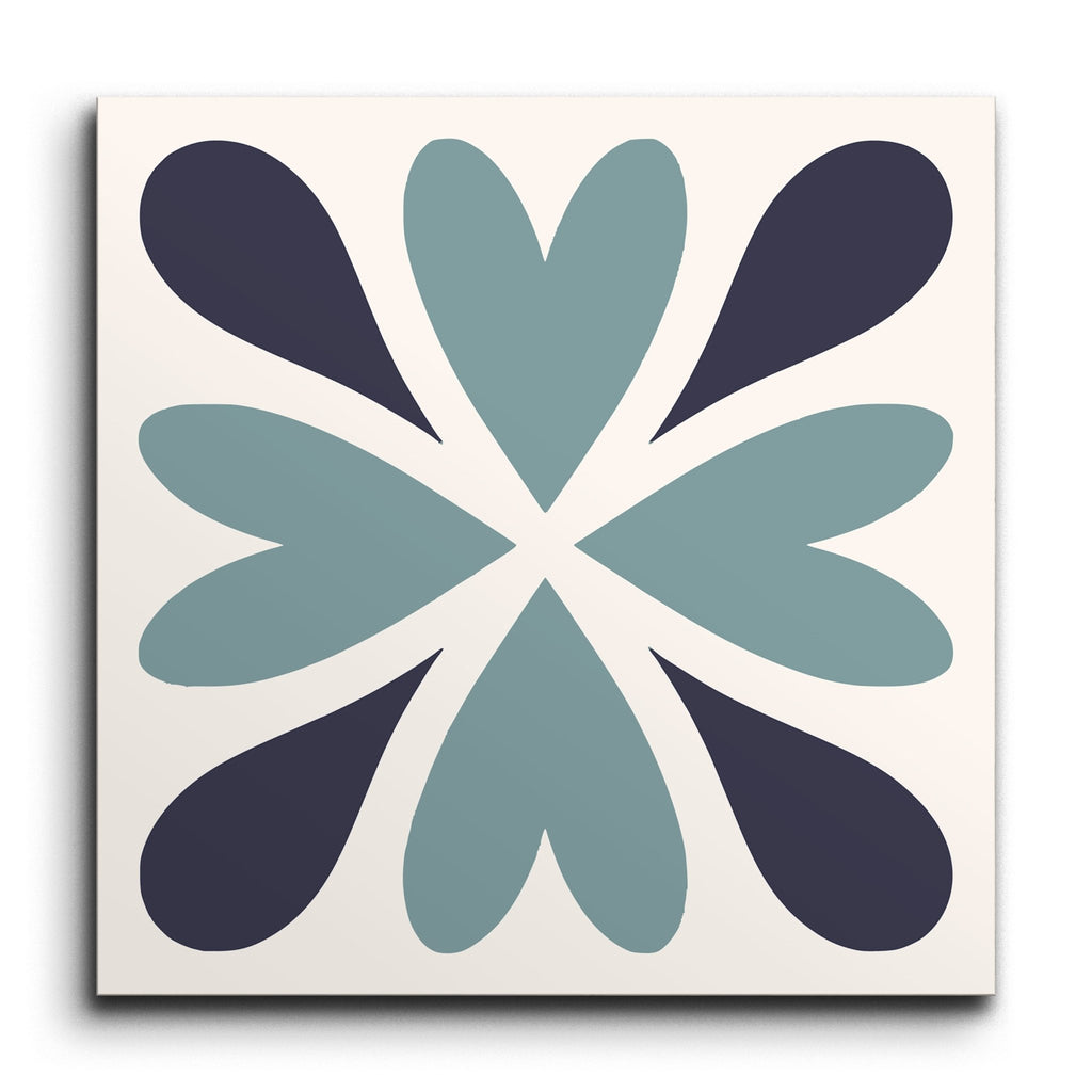 Diese Dekorfliese zeigt ein faszinierendes Enkaustikmuster mit einem symmetrischen Design und einem zentralen Motiv, das einer Blume oder einem Stern ähnelt. Sie kombiniert kunstvoll Herz- und Tropfenformen in gedämpftem Türkis und dunklem Marineblau, die sich wunderschön von einem hellen Cremehintergrund abheben. Der klassische, aber dennoch moderne Stil dieser Fliese macht sie zu einer vielseitigen Wahl, die jedem Dekor eine Note von Eleganz und Faszination verleiht.