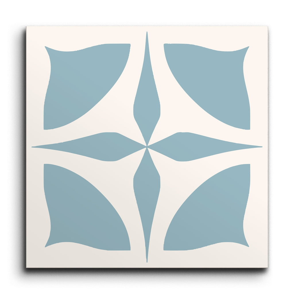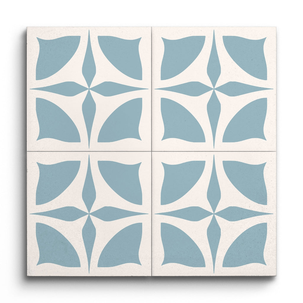 Diese Dekorfliese präsentiert einen klassischen Enkaustik-Stil mit einem symmetrischen Muster aus vier blütenblattähnlichen Formen, die von einem zentralen Punkt ausgehen. Die sanften Blautöne kontrastieren wunderschön mit dem cremefarbenen Hintergrund und bieten eine beruhigende und zeitlose Ästhetik. Ihre elegante geometrische Symmetrie macht sie zu einer vielseitigen Wahl für jeden Raum und verbindet traditionellen Charme mit zurückhaltender Raffinesse.