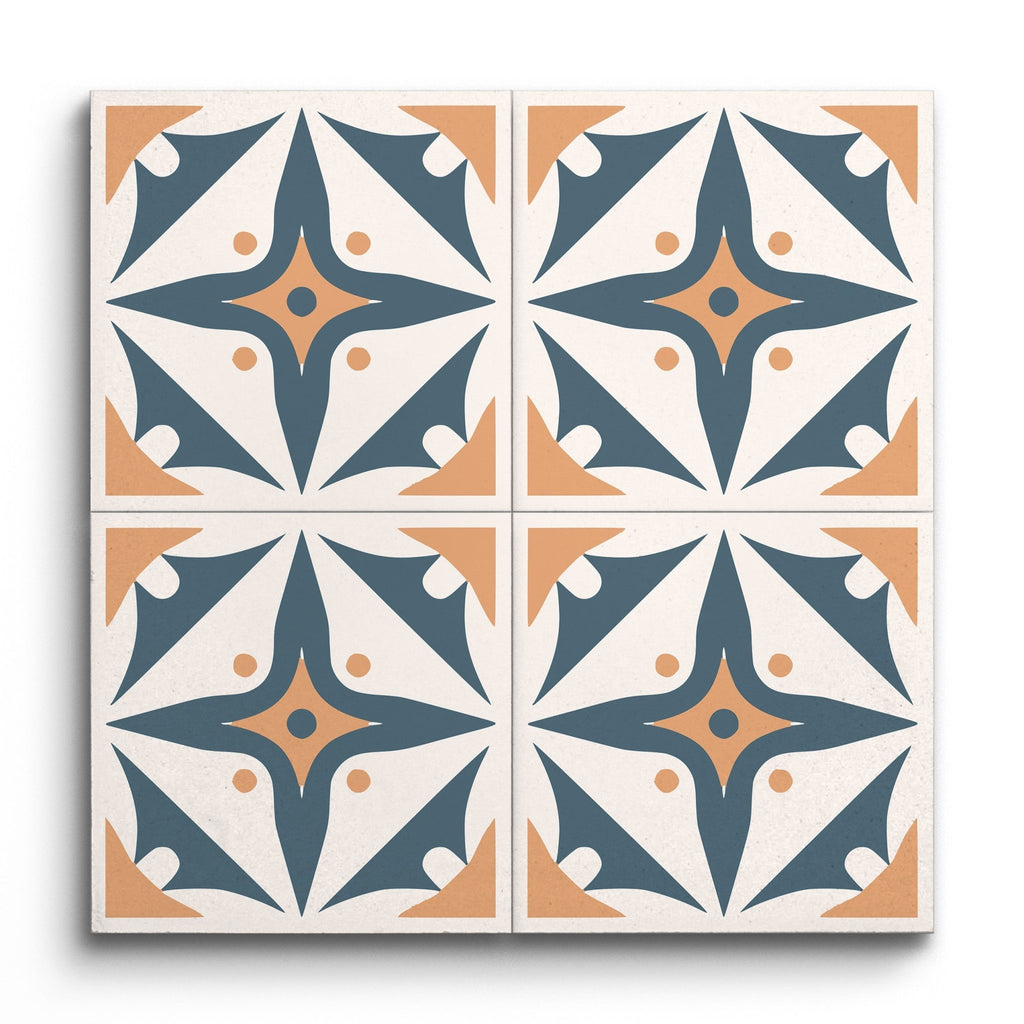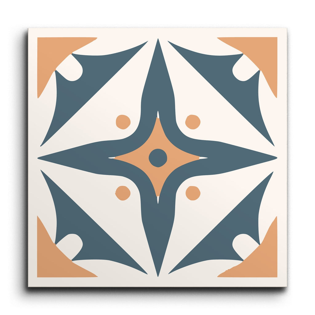 Diese Dekorfliese präsentiert ein faszinierendes geometrisches Design, inspiriert von traditionellen Einlegearbeiten. Die Anordnung ist um eine markante Rautenform zentriert, umgeben von eckigen Dreiecken und kreisförmigen Elementen, die zusammen ein komplexes visuelles Geflecht bilden. Die tiefen blau-grauen und warmen Terrakotta-Töne kontrastieren wunderschön und betonen die dynamische und zeitlose Ästhetik der Fliese. Perfekt, um jedem Raum einen Hauch von Eleganz und Raffinesse zu verleihen, hinterlässt das kräftige Muster und die satten Farben dieser Fliese einen eindrucksvollen Eindruck.