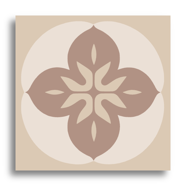 This decor tile showcases a captivating symmetrical pattern with a central floral motif, echoing the charm of traditional encaustic tiles. Its earthy palette of brown and cream exudes warmth and invites a cozy ambiance. The design strikes a balance between boldness and elegance, offering a vintage aesthetic that complements both classic and rustic interiors. The gentle curves and petal-inspired shapes bring a subtle softness to the geometric composition, making it a timeless addition to any space.