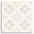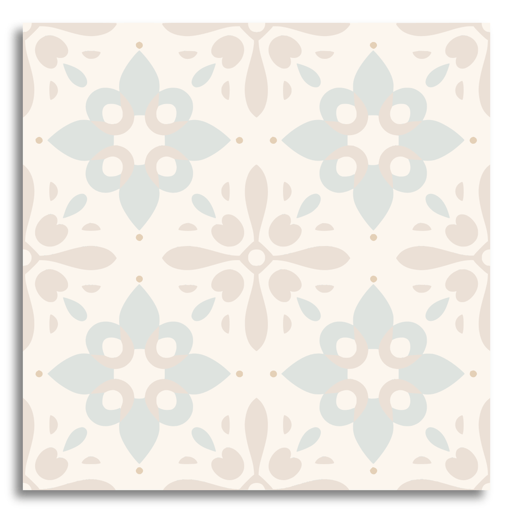 This decor tile presents a symmetrical, floral-inspired pattern characteristic of classic encaustic designs. Soft blue and gray tones gracefully interweave against a light beige backdrop, forming petal-like shapes and abstract motifs. The repeating elements create a balanced and elegant aesthetic, echoing traditional European architecture with a timeless charm.