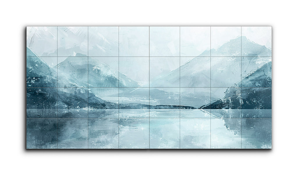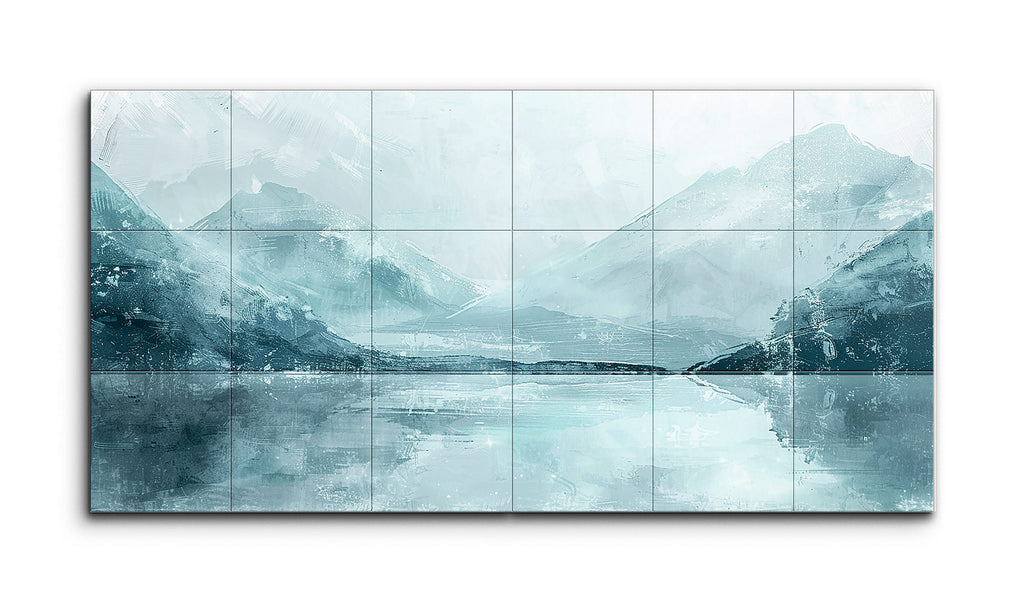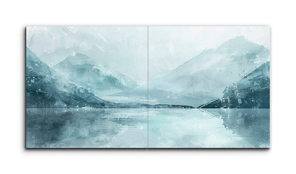 Dieses Diptychon-Fliesenbild zeigt eine ruhige, bergige Landschaft, die wahrscheinlich eine kalte, winterliche Szene darstellt. Dominiert von kühlen Blau- und Weißtönen, verwendet das Kunstwerk lose, expressive Pinselstriche, um die zerklüfteten Berge und das stille Wasser im Vordergrund darzustellen. Die Spiegelungen der Berge im Wasser fügen Symmetrie und Ruhe hinzu und verschmelzen zu einer fast abstrakten Interpretation. Subtiles Licht und Schatten erzeugen ein sanftes, ätherisches Leuchten, das Stimmung und Atmosphäre in einem zeitgenössischen Stil betont.