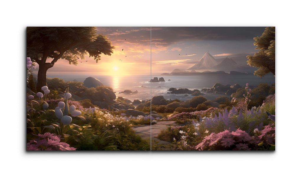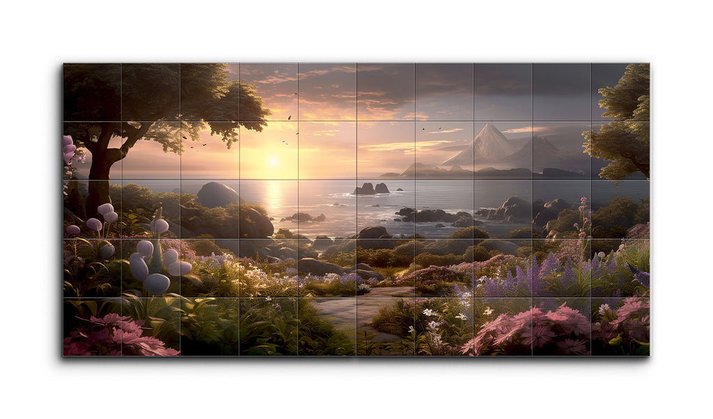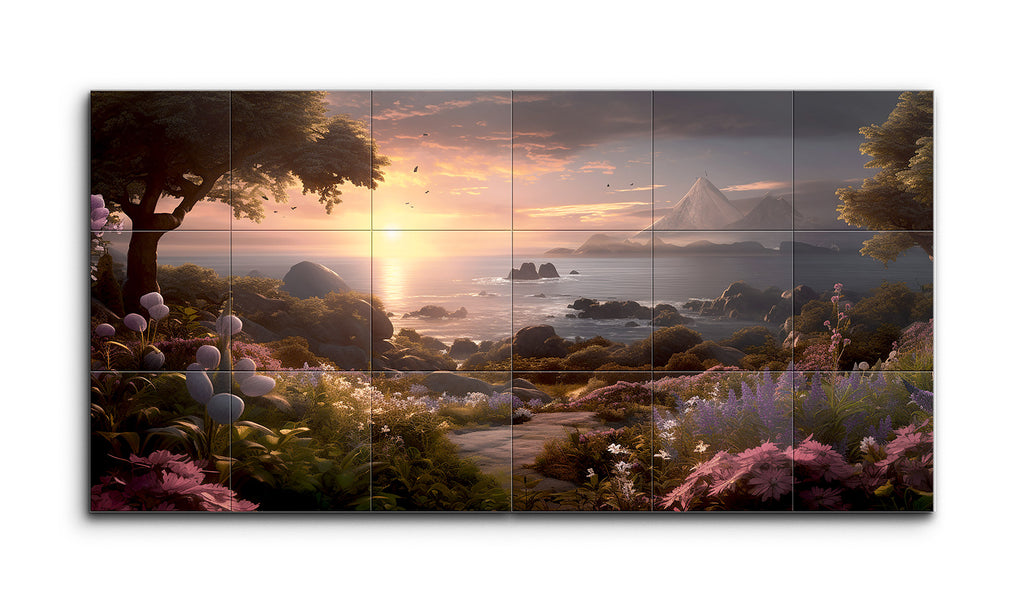Dieses Fliesenbild präsentiert eine ruhige Landschaft im Diptychon-Format, mit einem üppigen Garten im Vordergrund, der lebendige Blumen in Rosa-, Lila- und Grüntönen zeigt. Der Garten geht nahtlos in eine felsige Küste über, die zu einem ruhigen Meer führt, das die goldenen Töne einer tief stehenden Sonne widerspiegelt. Im Hintergrund erheben sich nebelverhangene Berge aus dem Meer unter einem Farbverlaufshimmel in Gelb, Lila und Blau. Das Kunstwerk verbindet Realismus und Romantik und schafft eine friedliche, ehrfurchtgebietende Szene.