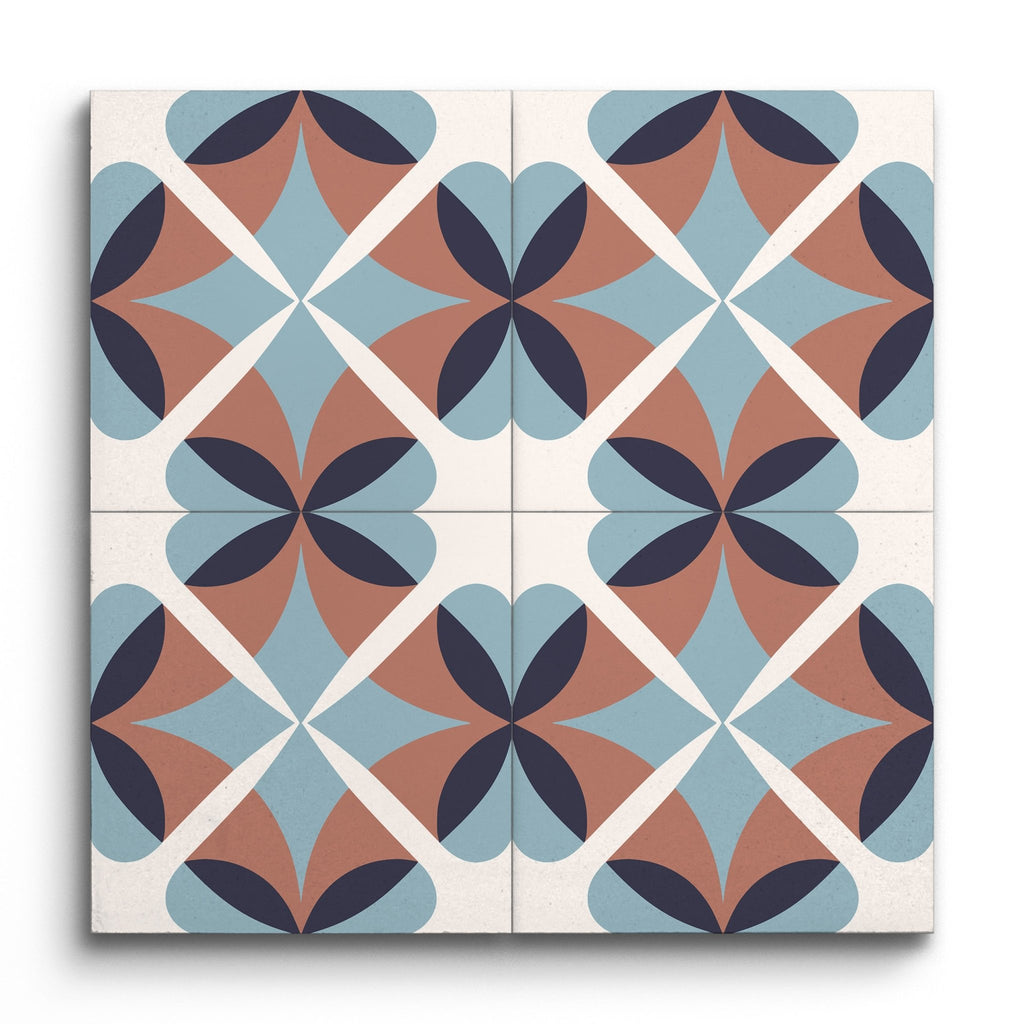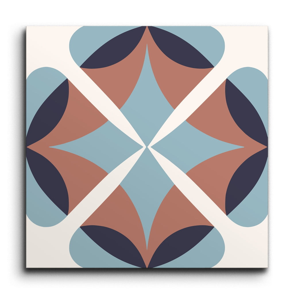 Diese Dekorfliese präsentiert ein fesselndes geometrisches Muster, das symmetrische Formen mit sowohl geschwungenen als auch eckigen Elementen für eine eindrucksvolle visuelle Anziehungskraft vereint. Die erdigen Brauntöne, gedämpften Blautöne und dunklen Marinefarben kontrastieren wunderschön mit einem hellen Cremehintergrund und schaffen einen kräftigen, aber harmonischen Look. Sie ist die ideale Wahl, um jedem Raum einen Hauch von modernem oder zeitgenössischem Stil zu verleihen.