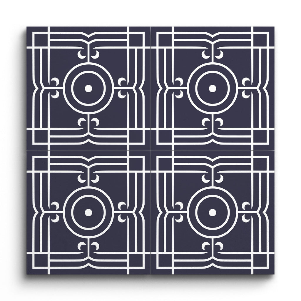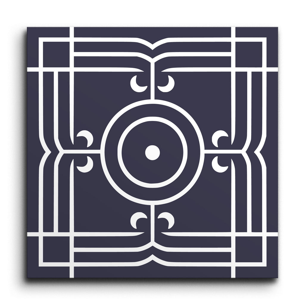Diese Dekorfliese zeigt ein fesselndes geometrisches Muster, das von einem zentralen Kreis hervorgehoben wird, der das Design verankert. Symmetrische Linien und Formen strahlen nach außen und vermitteln ein Gefühl von Balance und Harmonie. Die klaren weißen Linien auf einem tiefen Marinehintergrund schaffen einen auffälligen Kontrast und lenken die Aufmerksamkeit auf die saubere, präzise Geometrie. Das Design verkörpert eine moderne, minimalistische Ästhetik, die Einfachheit und Struktur betont und zeitgenössische Räume ergänzt.