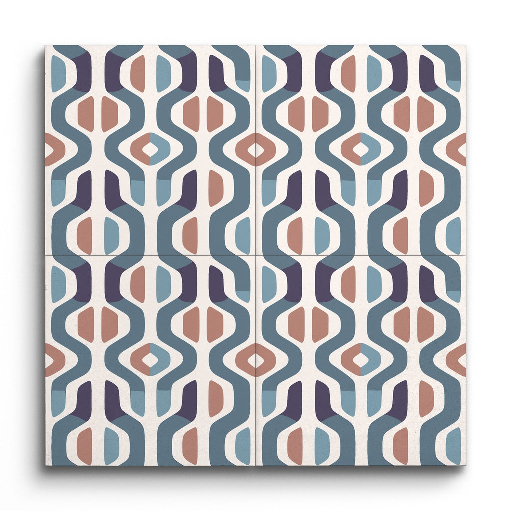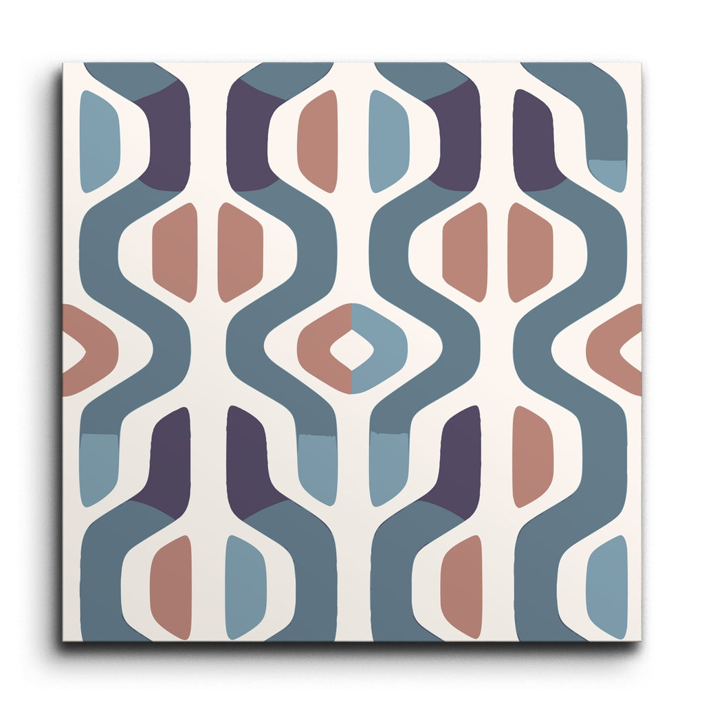 Diese Dekorfliese fängt das Wesen des Mid-Century-Modern-Stils mit ihrem markanten geometrischen Design ein. Ihr Muster zeigt ein dynamisches Zusammenspiel abstrakter Formen und erzeugt einen rhythmischen Fluss, der das Auge anzieht. Die Farbpalette, eine Mischung aus gedämpften Blautönen, Brauntönen und Cremefarben, beschwört den nostalgischen Charme der Ära herauf und bewahrt dabei eine zeitlose Eleganz. Symmetrie und Balance stehen im Mittelpunkt dieses Designs und bieten eine harmonische Ergänzung für jeden Raum.