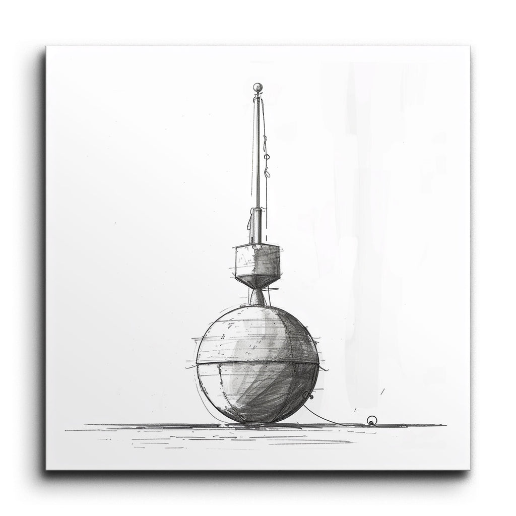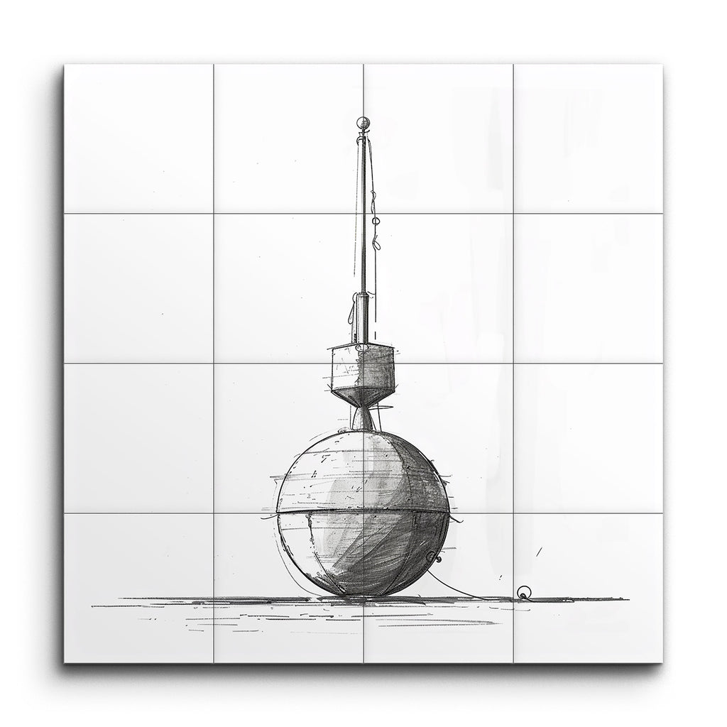 Erheben Sie Ihren Raum mit diesem faszinierenden Fliesenbild, das eine minimalistische, monochromatische Skizze geometrischer Eleganz zeigt. Eine große Kugel ruht auf einer flachen Oberfläche, gekrönt von einem kleineren Zylinder und einer hohen, dünnen Stange, die in einer zarten Kugel endet. Die sauberen, präzisen Linien vermitteln ein architektonisches Gefühl, das durch eine handgezeichnete Qualität gemildert wird. Subtile Details wie ein dünnes Seil und ein kleiner runder Gegenstand fügen Komplexität hinzu und schaffen ein harmonisches Gleichgewicht, das das Auge anzieht und die Vorstellungskraft anregt.