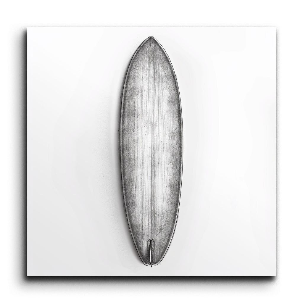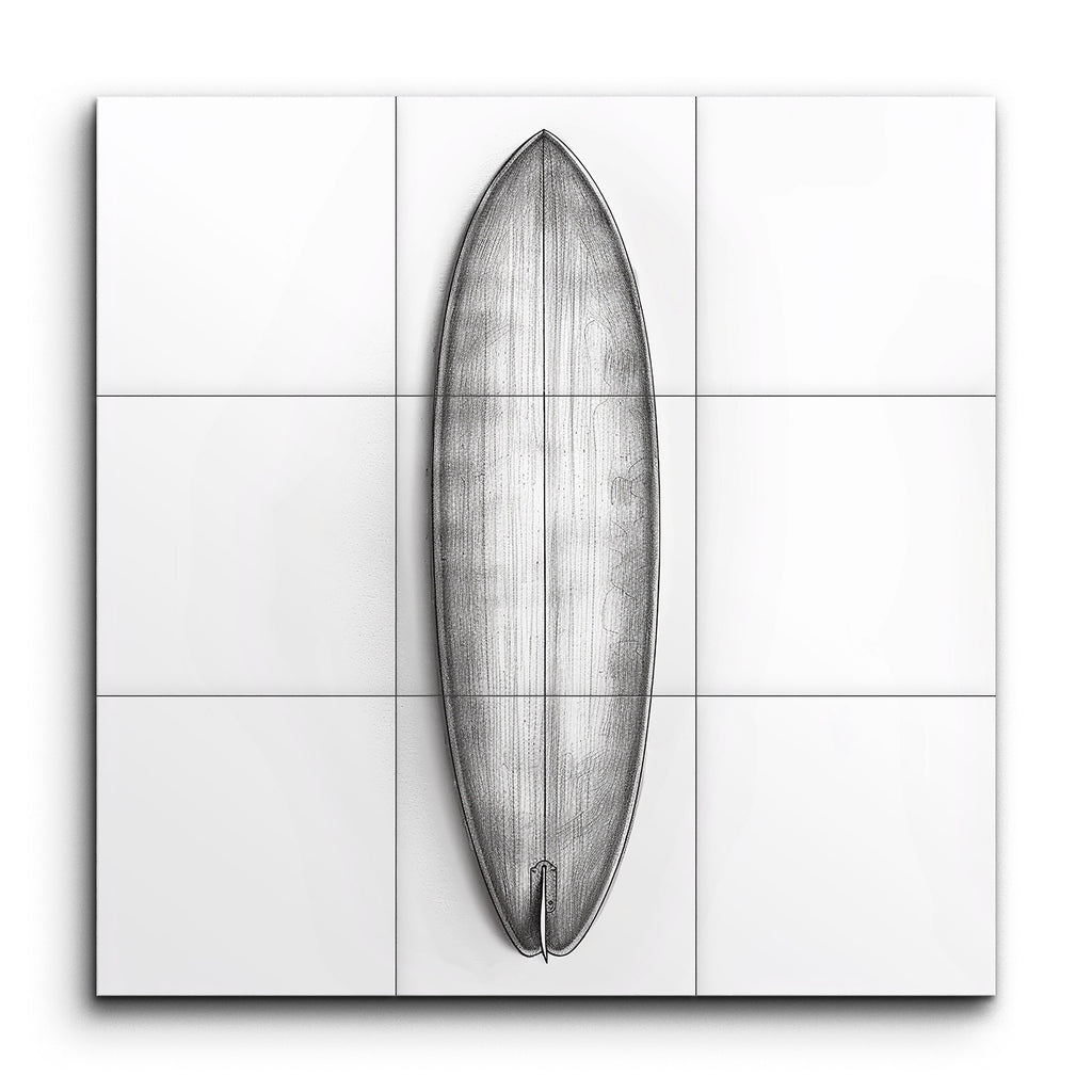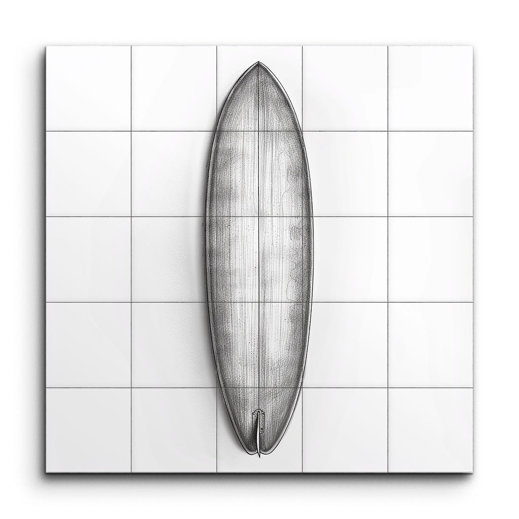 Verwandeln Sie Ihren Raum mit unserem atemberaubenden Fliesenbild, das eine akribisch detaillierte Surfbrett-Illustration zeigt. Dieses Kunstwerk fängt die Eleganz des Surfbrett-Designs ein und präsentiert es aus der Vogelperspektive, um seine langgestreckte, stromlinienförmige Form zu zeigen. Die spitze Nase und das abgerundete Heck, komplett mit einer einzelnen Finne, sind mit feinen Linien und fachmännischer Schattierung dargestellt, um einen dreidimensionalen Effekt zu erzeugen. Die minimalistische, monochrome Farbpalette betont die Form und Struktur und verkörpert eine technische, architektonische Ästhetik. Perfekt für Surf-Enthusiasten und Liebhaber fein gearbeiteter Designs.