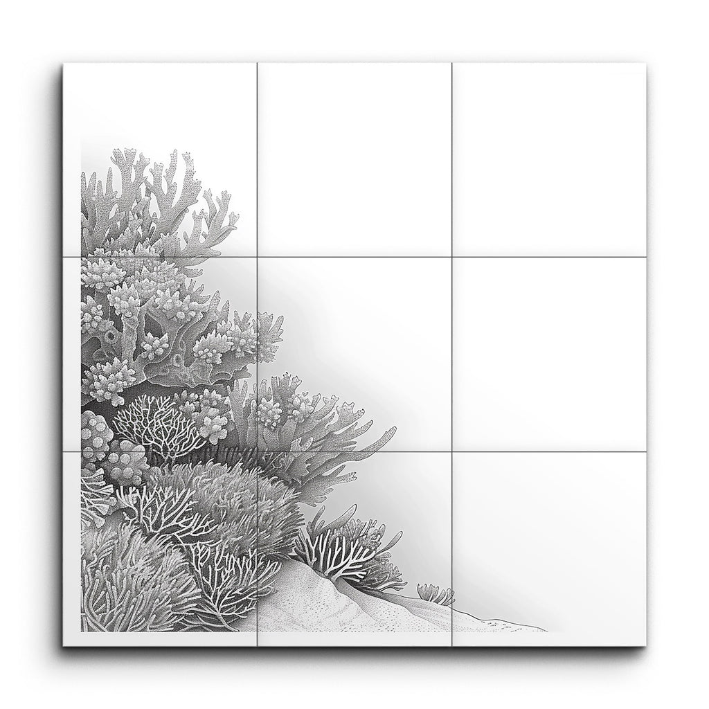 Tauchen Sie ein in die komplexe Schönheit der Tiefsee mit unserem monochromen Graustufen-Fliesenbild, das eine faszinierende Unterwasserkorallenriffszene darstellt. Dieses Kunstwerk fängt die reiche Vielfalt des Meereslebens mit akribischer Detailgenauigkeit ein und zeigt verschiedene Korallen und Meeresflora in atemberaubender dreidimensionaler Tiefe. Inspiriert von Papierschneidetechniken erscheint jedes Element fein geschnitzt, wodurch ein zeitloses und elegantes Stück entsteht, das die ruhige Komplexität des Ozeans in jeden Raum bringt.