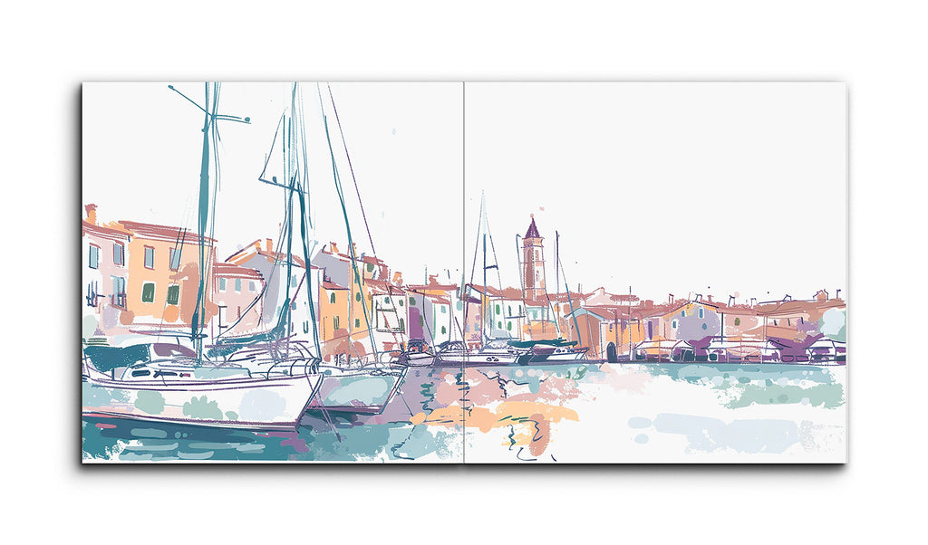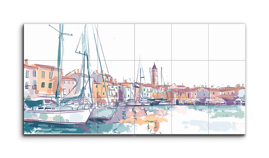 Dieses Fliesenbild präsentiert eine lebendige Hafenszene in einem modernen, halb-abstrakten Stil, aufgeteilt in zwei Paneele, die eine kontinuierliche Panoramaansicht bilden. Im Vordergrund sind Boote und Yachten mit unterschiedlichen Masten zu sehen, die mit lockeren Strichen dargestellt sind, welche die reflektierende Natur des Wassers mit Blau-, Weiß- und Orangetönen andeuten. Der Hintergrund zeigt stilisierte Gebäude in warmen Pastellfarben, die eine sonnige mediterrane Küstenstadt hervorrufen. Die energetische Pinselführung und der expressive Einsatz von Farben schaffen eine verspielte, dynamische Atmosphäre.