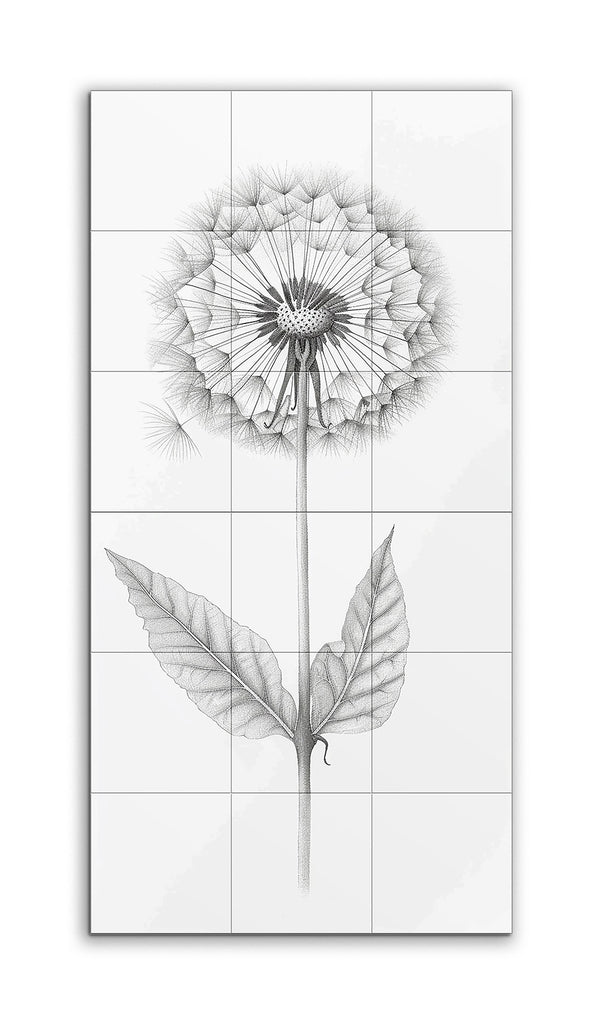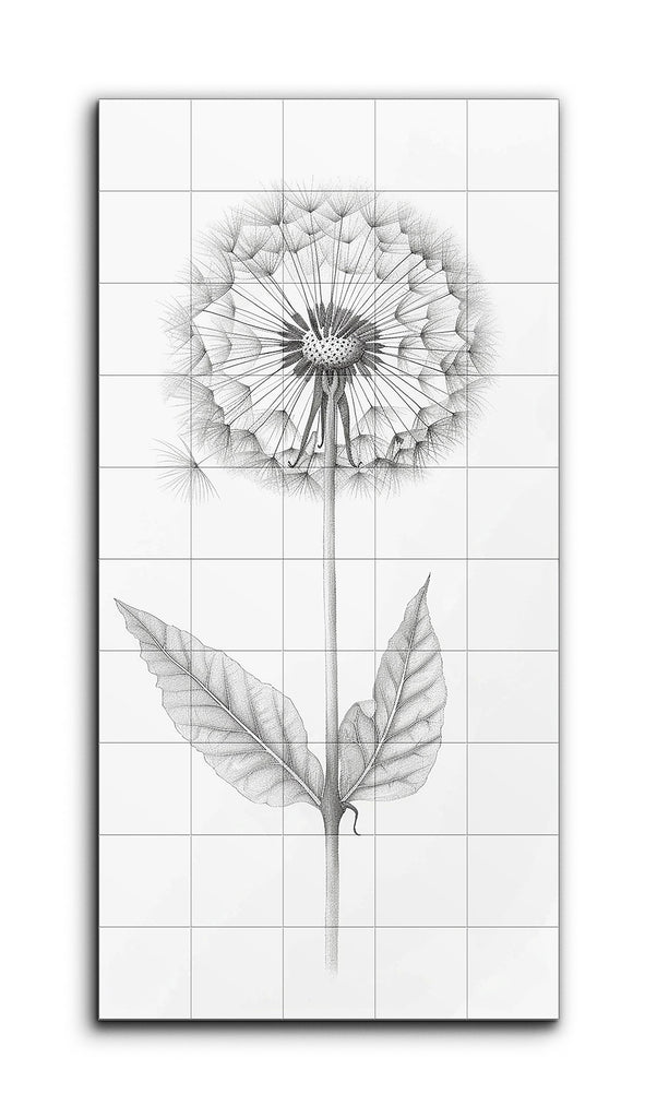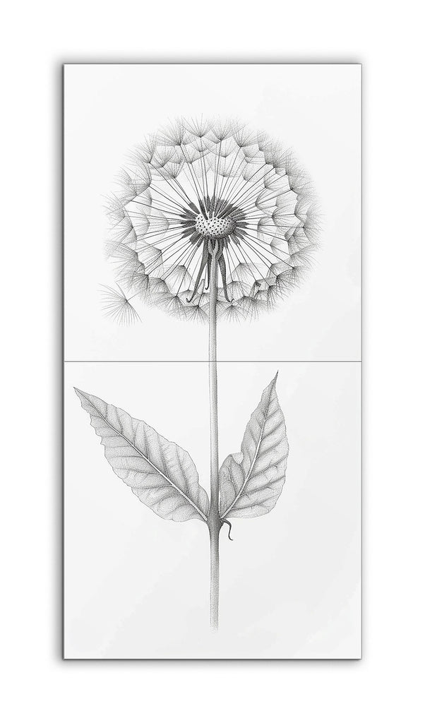 Dieses Kunstwerk zeigt eine akribisch detaillierte und realistische Illustration einer Löwenzahnpflanze, die in einer monochromen Farbpalette dargestellt ist. Die Komposition ist vertikal, mit dem Blütenkopf oben und dem Stiel und den Blättern darunter. Die federartigen Samen des Löwenzahns sind kunstvoll gezeichnet, einige schweben davon, um natürliche Bewegung anzudeuten. Der Stiel ist schlank und gerade, während die breiten Blätter mit faltigen Texturen und gezackten Rändern dargestellt sind. Feine Linien und Schattierungen schaffen eine lebensechte, zeitlose botanische Illustration.