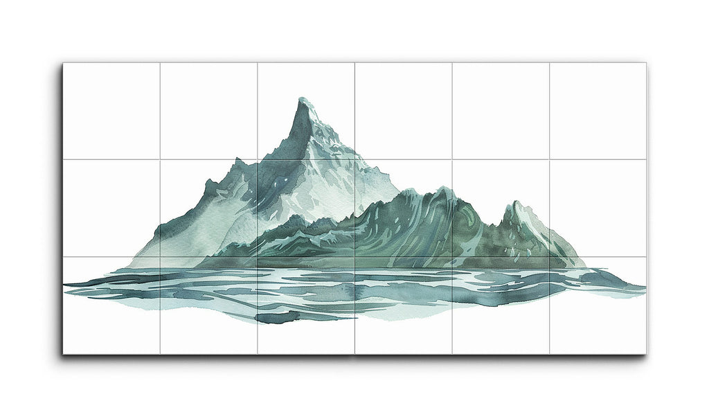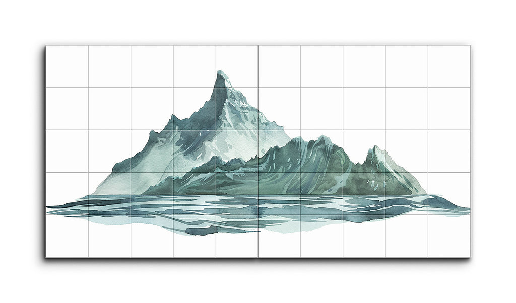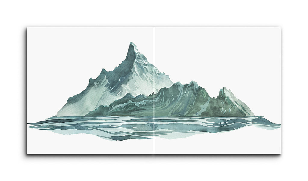 Dieses zweiteilige Fliesenbild stellt eine majestätische Bergkette dar, die sich in einem ruhigen Gewässer spiegelt. Der etwas abstrakte Stil betont Form und Farbe, wobei der Berg in verschiedenen Grün- und Blautönen dargestellt wird, akzentuiert durch weiße Highlights, die schneebedeckte Gipfel andeuten. Flüssige Pinselstriche verleihen dem Bild eine gewisse Bewegung, während die Spiegelung des Berges im Wasser sanfte, gedämpfte Farbtöne und horizontale Striche aufweist, die eine glasige, ruhige Oberfläche schaffen. Die kühlen Farben rufen ein Gefühl von Gelassenheit und natürlicher Erhabenheit hervor, wobei das zweiteilige Format eine moderne, fensterartige Ansicht bietet.