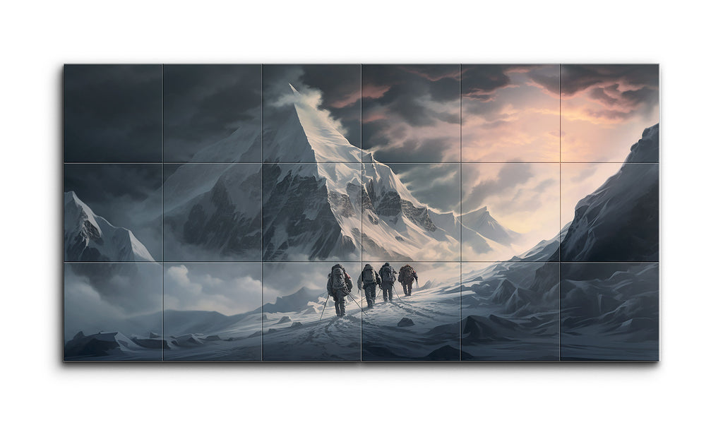 Dieses Fliesenbild zeigt eine dramatische Bergszene, die durch digitale Malerei zum Leben erweckt wird. Im Vordergrund wandern vier Bergsteiger über eine verschneite Landschaft, wobei ihre detaillierte Ausrüstung die harten Bedingungen hervorhebt. Der Mittelgrund zeigt einen majestätischen, kunstvoll detaillierten Berggipfel mit scharfen Kanten und Schneeschichten. Ein dynamischer Himmel im Hintergrund, mit Farbtönen von Rosa, Orange, Blau und Grau, deutet auf einen Sonnenaufgang oder Sonnenuntergang hin und verleiht dem Kunstwerk Tiefe und eine eindrucksvolle Atmosphäre.