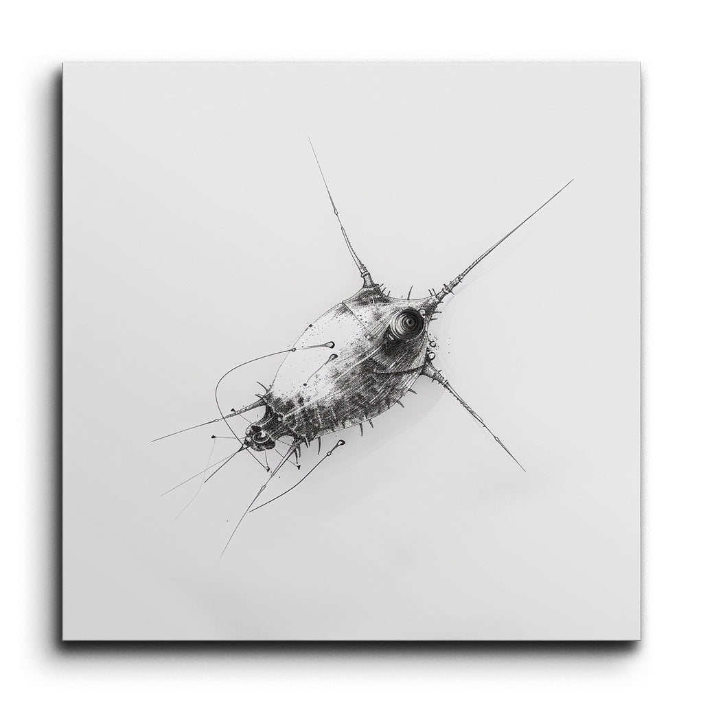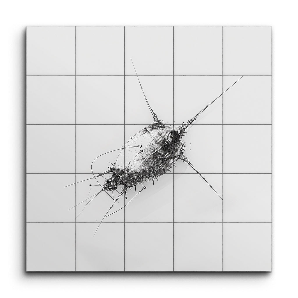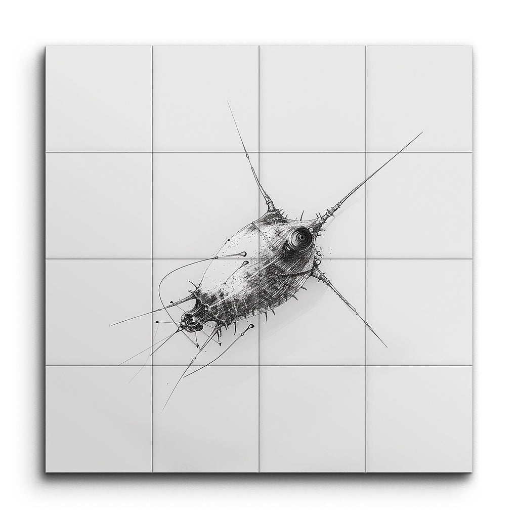 Entdecken Sie die faszinierende Welt des mikroskopischen Lebens mit unserem Fliesenbild, das eine hochdetaillierte, monochrome Illustration eines einzelligen Protozoons zeigt. Dieses Kunstwerk fängt die komplexe Schönheit des Organismus mit akribischer Präzision ein und zeigt seinen ovalförmigen Körper, halbtransparente innere Strukturen und zarte, haarähnliche Anhängsel. Ein auffälliges, augenähnliches Merkmal mit konzentrischen Ringen zieht die Aufmerksamkeit des Betrachters auf sich und verleiht Tiefe und Fokus. Erinnert an wissenschaftliche Illustrationen, betont dieses Mosaik Klarheit und Realismus und verwandelt jeden Raum in ein Fenster zum Unsichtbaren.