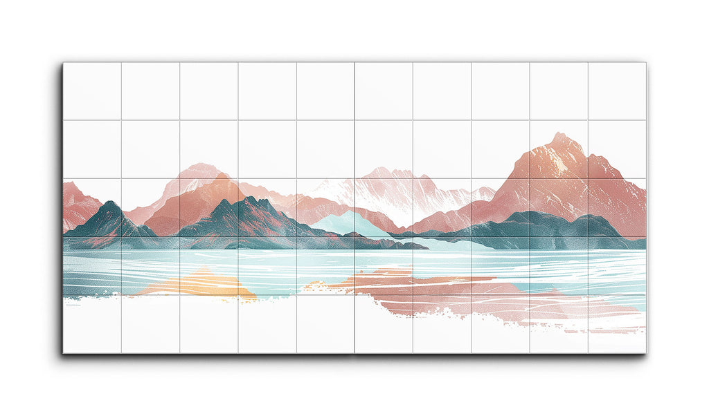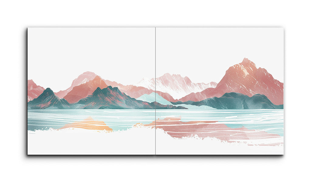 Dieses Fliesenbild zeigt eine moderne, stilisierte Darstellung einer bergigen Landschaft in einem minimalistischen, abstrakten Stil. Geometrische Formen und eine begrenzte Farbpalette erwecken die Naturszenerie zum Leben. Scharfe, winklige Berge in Rosa-, Korallen- und Türkistönen fangen das Licht ein und suggerieren Morgendämmerung oder Abenddämmerung. Der Vordergrund zeigt horizontale Streifen in Türkis, Weiß und Sandtönen, die übereinandergelegt sind, um Tiefe und Bewegung zu erzeugen. Das zweiteilige Format verleiht dem Werk Breite und schafft eine ruhige, zeitgenössische Ästhetik.