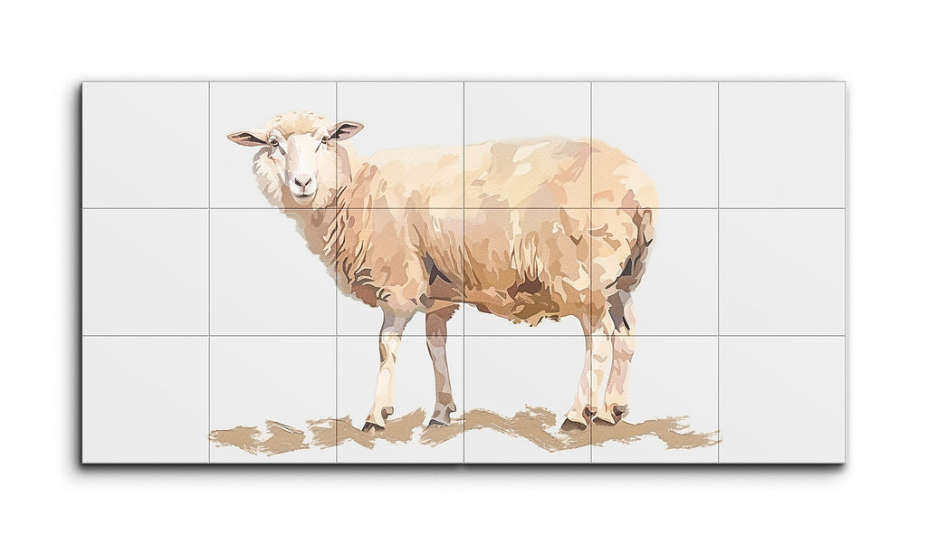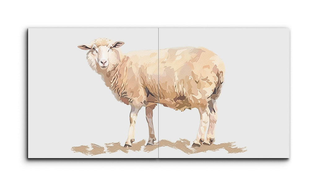 Dieses zweiteilige Fliesenbild zeigt ein Schaf, das in einem Stil dargestellt ist, der an Vektor- oder Low-Polygon-Kunst erinnert. Das Kunstwerk verwendet flache Farbflächen und minimale Details, um Tiefe und Form zu erzeugen. Das Schaf ist über die beiden Tafeln zentriert, wobei sein Körper auf der linken Seite und der Kopf zum Betrachter hin gedreht ist und sich in das rechte Panel erstreckt. Naturgetreue Schattierungen von Beige, Creme und Hellbraun definieren die Wolle, mit Andeutungen von Rosa um die Nase und Ohren. Der minimalistische Hintergrund und der dezente Schatten verstärken die moderne, saubere Ästhetik.
