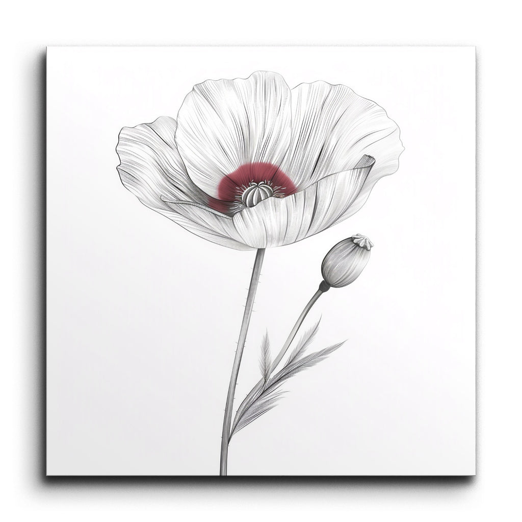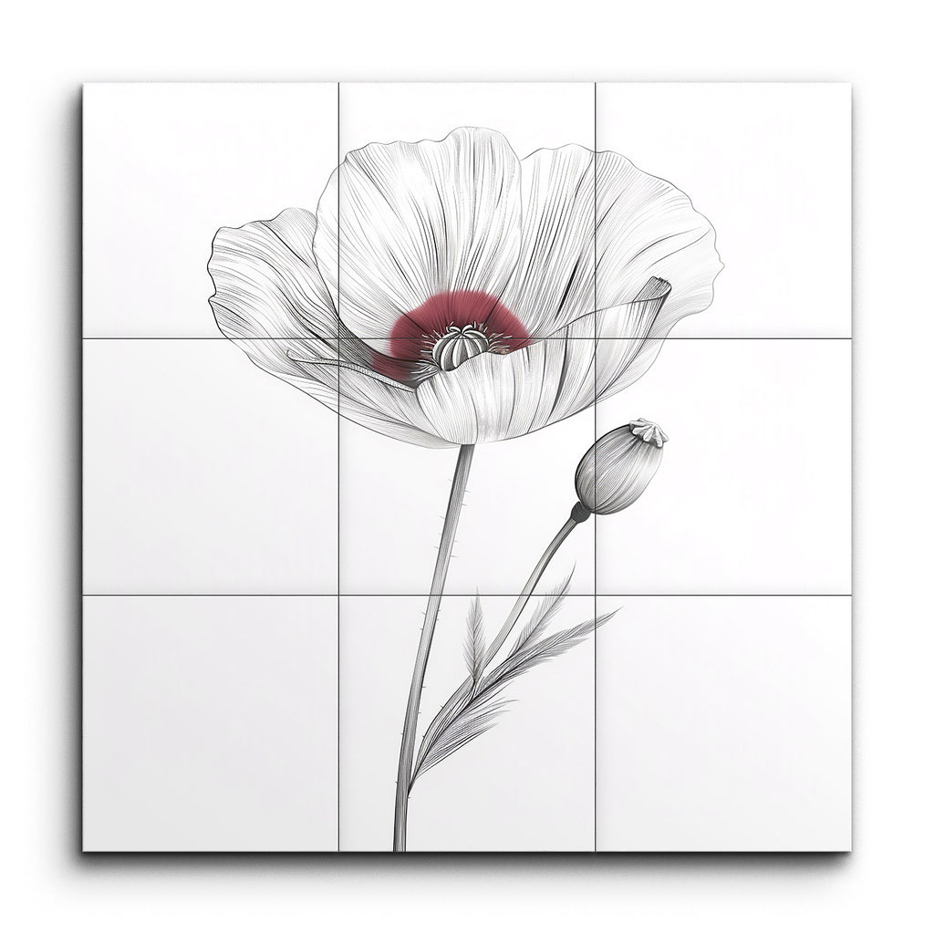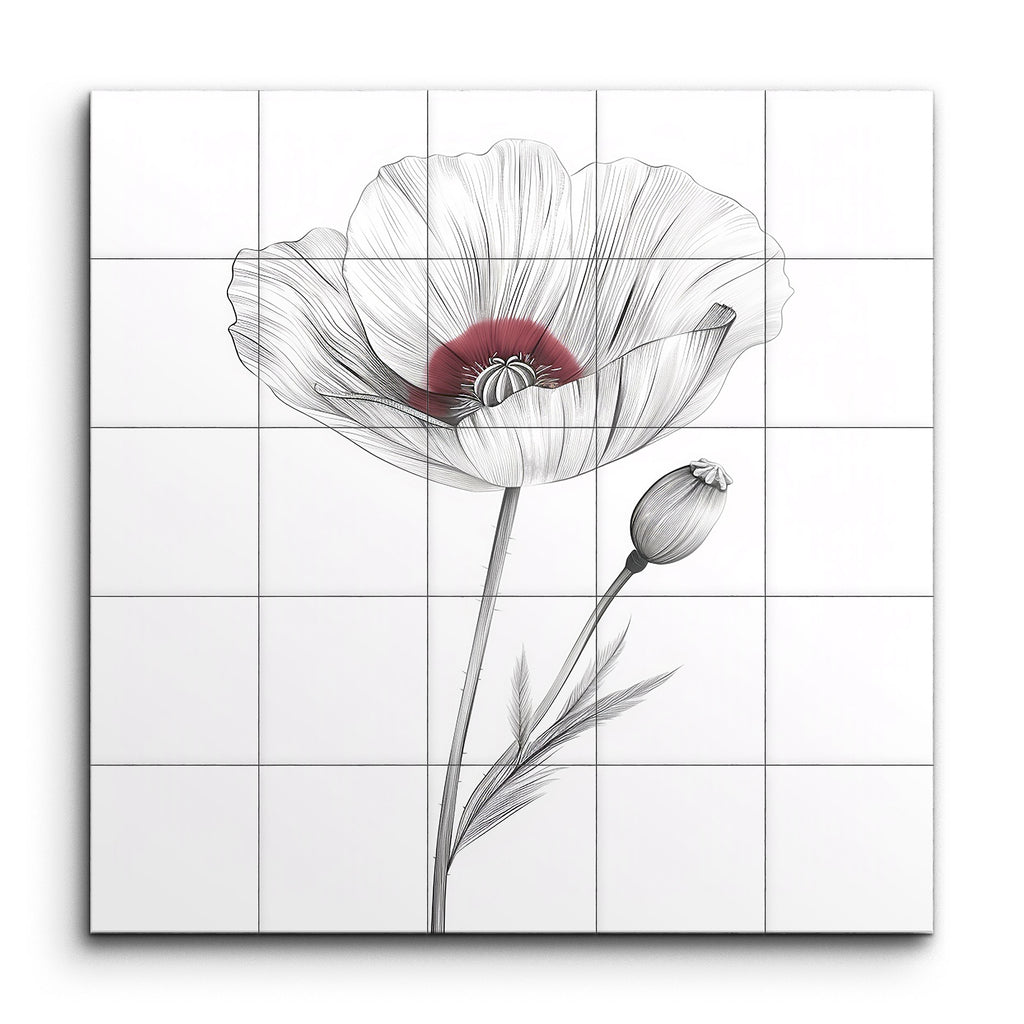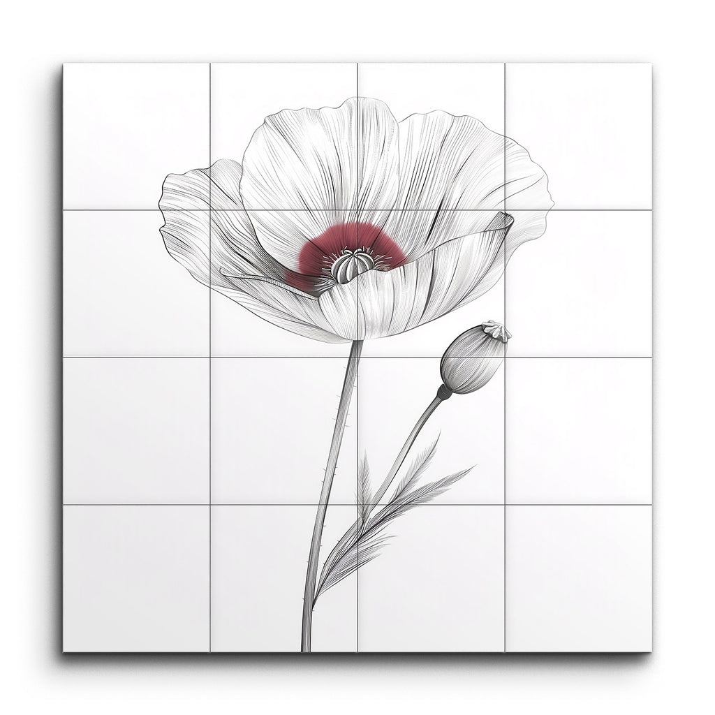 Verwandeln Sie Ihren Raum mit diesem exquisiten Fliesenwandbild mit einer zarten und detaillierten Illustration einer Mohnblume. Der minimalistische und raffinierte Stil zeigt feine, präzise Linien, die die komplexe Struktur und Textur der Blume betonen. Dezente, fließende Linien fangen die sanften Kurven und natürlichen Falten der Blütenblätter ein, wobei ein weicher, gedämpfter Rotton die Mitte der Blume hervorhebt. Die elegante Komposition mit ihrem anmutigen Stiel und ihrer Knospe verleiht jeder Umgebung eine zeitlose und klassische Schönheit.
