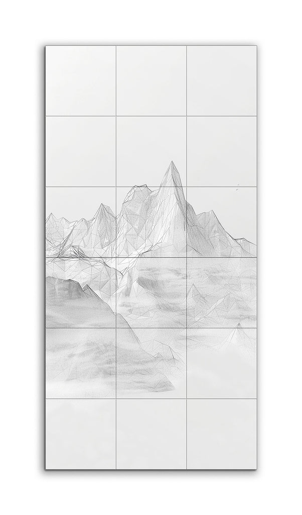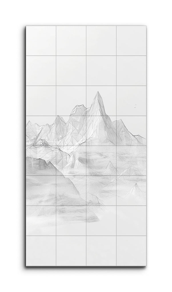 Dieses Fliesenbild zeigt eine minimalistische und abstrakte Darstellung einer Berglandschaft. Feine, zarte Linien erzeugen einen geometrischen, drahtgitterartigen Effekt, der die Gipfel und Grate scharf definiert und Tiefe und Dimension verleiht. Der subtile Einsatz von Licht und Schatten bildet sanfte Verläufe, die die Konturen des Geländes andeuten. Eine monochrome Farbpalette aus verschiedenen Grautönen auf weißem Hintergrund verstärkt die minimalistische Ästhetik und die filigrane Linienführung. Die ausgewogene Komposition, bei der der höchste Gipfel leicht aus der Mitte versetzt ist, lädt zu einem ruhigen und kontemplativen visuellen Erlebnis ein.