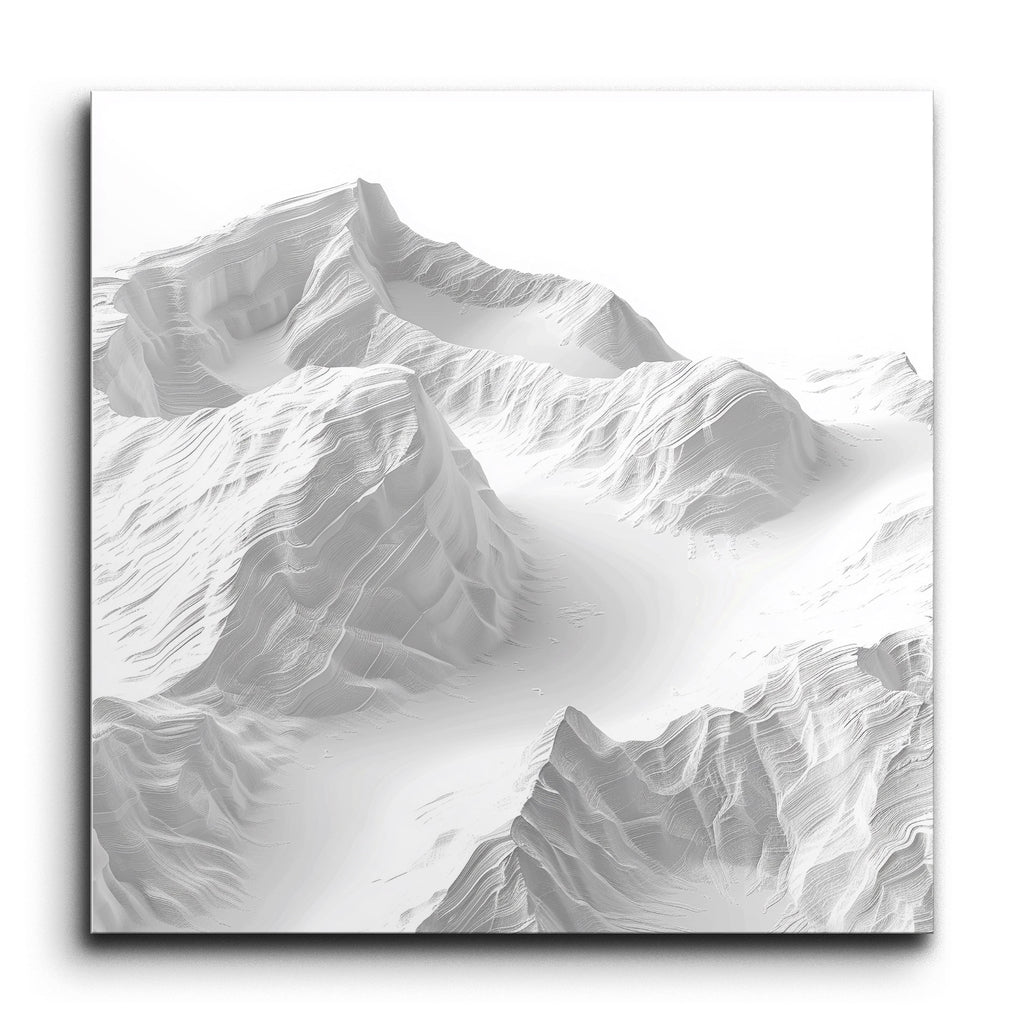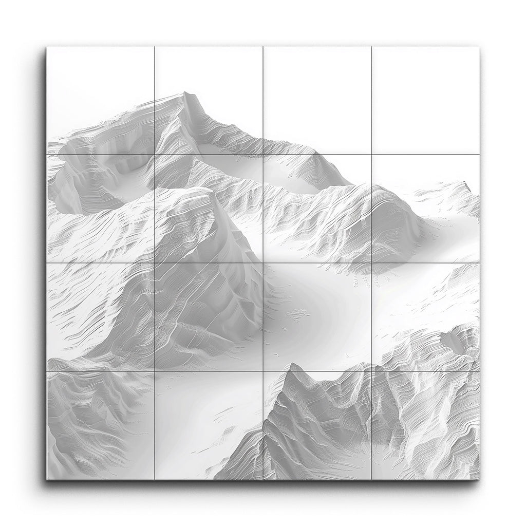 Verwandeln Sie Ihren Raum mit diesem atemberaubenden Fliesenbild, das eine akribisch detaillierte topografische Darstellung einer Berglandschaft zeigt. In einer raffinierten monochromen Farbpalette gehalten, fängt das Kunstwerk scharfe Grate, steile Hänge und tiefe Täler ein und vermittelt ein Gefühl von Tiefe und Realismus. Dieses minimalistische, aber präzise Stück betont die geometrische und strukturelle Schönheit der Natur und bietet eine moderne und abstrakte Interpretation, die sowohl auffällig als auch anspruchsvoll ist.