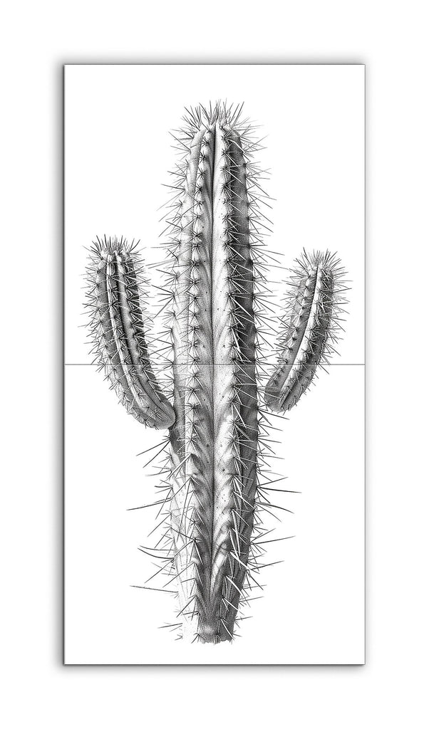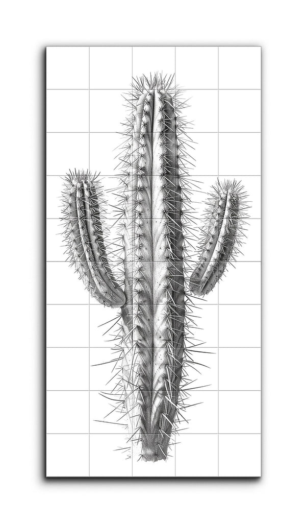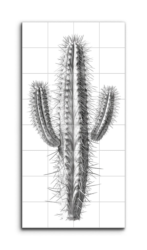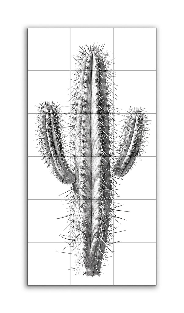Dieses Fliesenbild zeigt eine detaillierte, monochromatische Illustration eines Kaktus mit drei Hauptarmen. Der zentrale Arm ist der höchste, während die Seitenarme leicht nach oben gebogen sind und so eine natürliche Asymmetrie erzeugen. In Schwarz-Weiß-Tönen gehalten, besticht das Kunstwerk durch akkurate Linien und Schattierungen, die die Schärfe der Stacheln und die gerippte Textur des Kaktus einfangen. Durch die Kombination botanischer Illustration mit minimalistischer Ästhetik bietet dieses Stück eine beeindruckende, lebensechte Darstellung eines Kaktus.