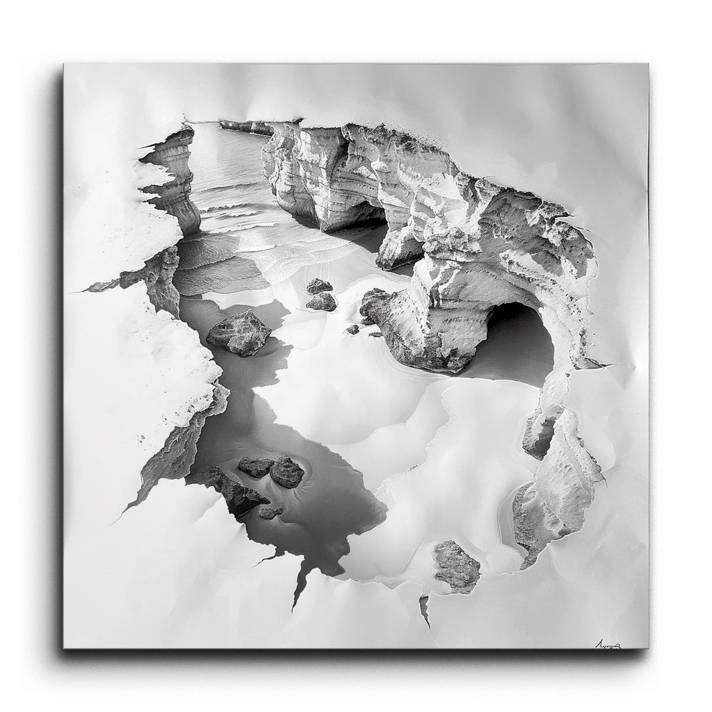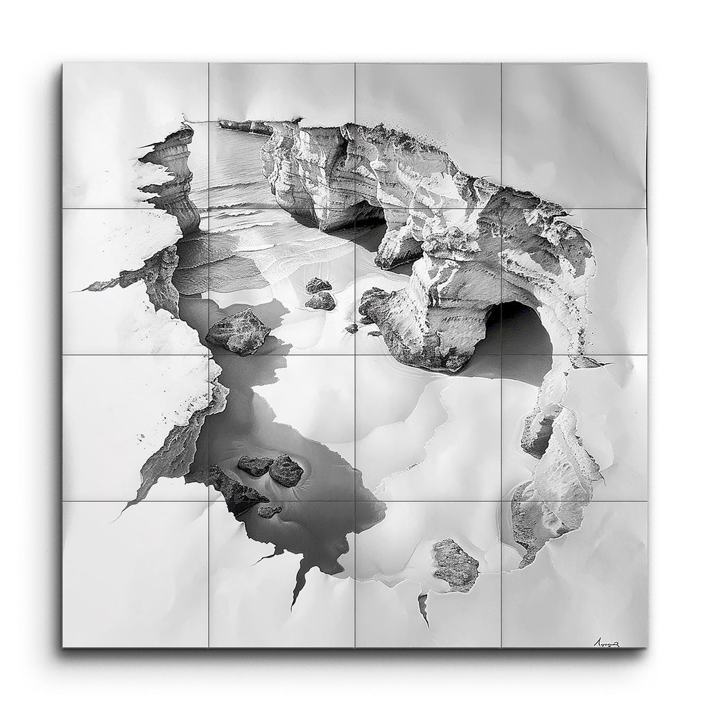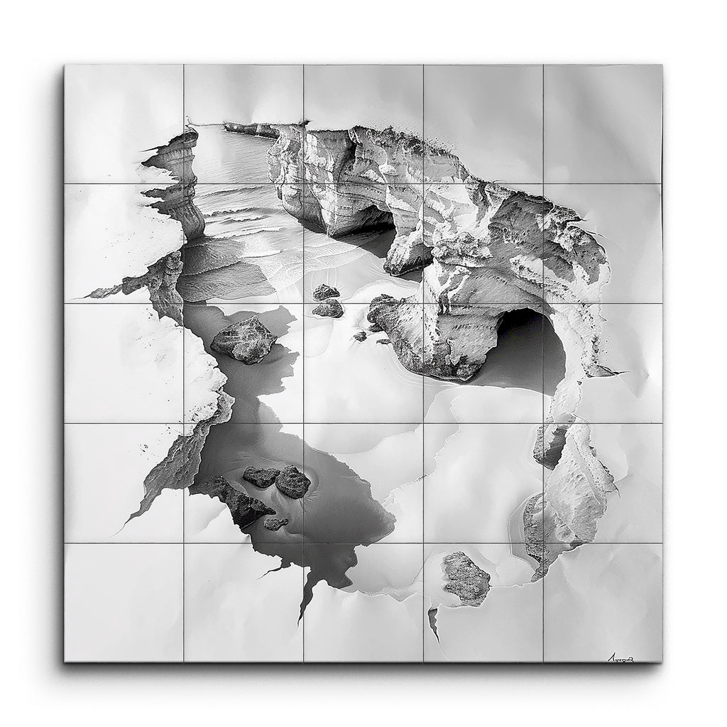 Erleben Sie die atemberaubende Schönheit der Natur mit diesem faszinierenden Fliesenbild. Das Kunstwerk zeigt eine beeindruckende Schwarz-Weiß-Darstellung einer zerklüfteten Küstenklippe oder Höhle, die akribisch detailliert ist, um die komplexen Texturen und Kontraste der Felsformation hervorzuheben. Die lebensechte Darstellung zeigt zerklüftete Kanten und Oberflächen, die durch Erosion geformt wurden, verstärkt durch geschickte Schattierungen, die Tiefe und Dimension hinzufügen. Ein ruhiger Wasserpool in der Mitte spiegelt die umliegenden Felsen wider und schafft eine friedliche Szene, die Sie in ihre hyperrealistische, monochrome Eleganz hineinzieht.