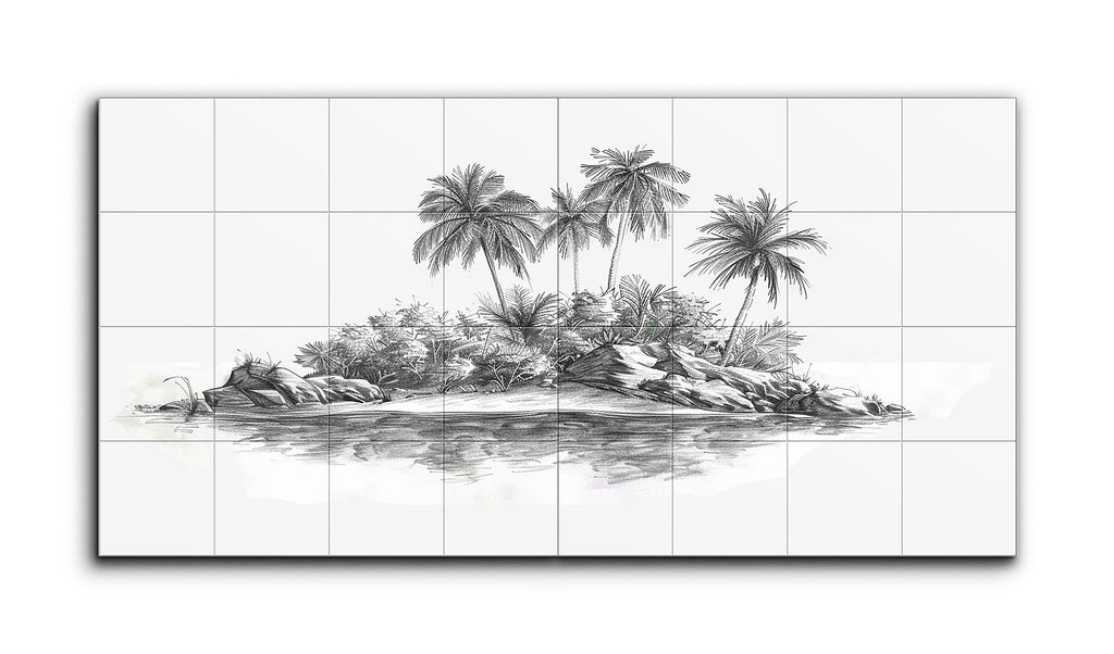 Dieses Fliesenbild zeigt eine ruhige tropische Szene, die auf zwei Paneele aufgeteilt ist und eine dichte Ansammlung von Palmen und üppiger Vegetation in monochromen Schattierungen von Schwarz, Grau und Weiß einfängt. Die detaillierte Linienführung der Palmwedel und des vielfältigen Laubs hebt die natürliche Vielfalt und Tiefe der Landschaft hervor. Im Vordergrund spiegelt ein reflektierendes Gewässer subtil die Szene darüber wider und trägt zur friedlichen Atmosphäre bei. Das Fehlen von Farbe betont die komplexen Texturen und Formen und lädt dazu ein, die natürlichen Elemente des Kunstwerks aus nächster Nähe zu schätzen.