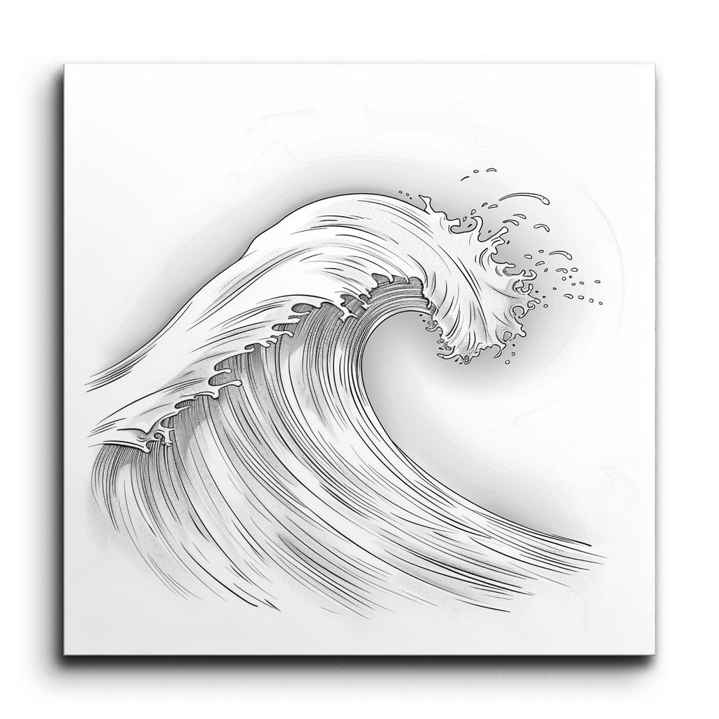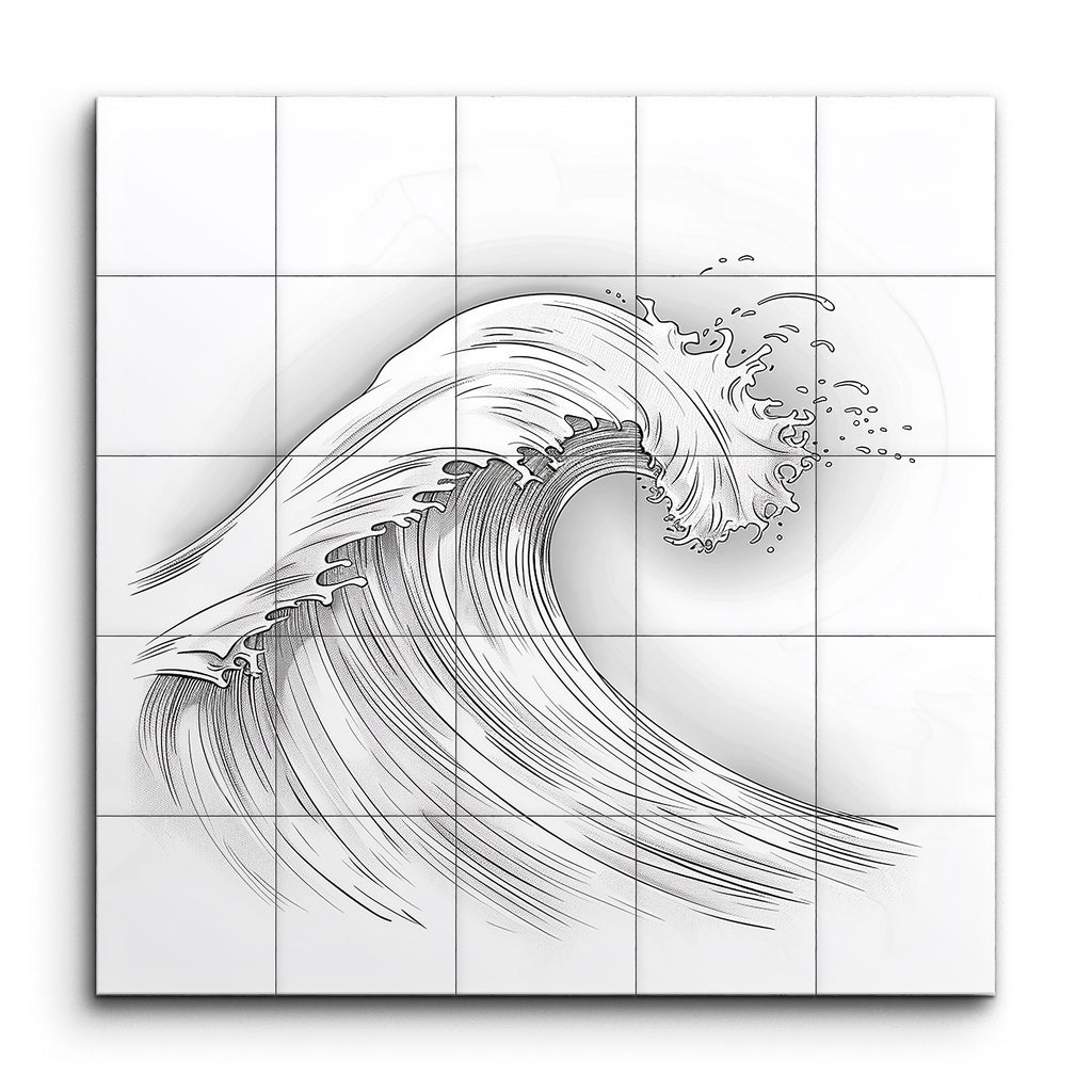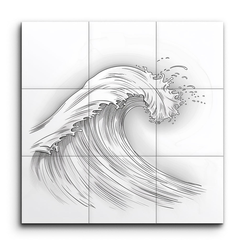 Tauchen Sie Ihren Raum in die dynamische Eleganz unseres minimalistischen Fliesenwandbildes, das eine stilisierte Welle in monochromer Pracht darstellt. Dieses Kunstwerk fängt die fließende Bewegung einer brechenden Welle durch präzise, geschwungene Linien und Kurven ein. Mit Spritzern und Tropfen detailliert, strahlt es ein Gefühl von Bewegung und Energie aus und betont die anmutige, aber kraftvolle Natur des Ozeans. Verwandeln Sie jeden Raum mit dieser eindrucksvollen Darstellung von natürlicher Schönheit und Kraft, die Linie und Form perfekt ausbalanciert.
