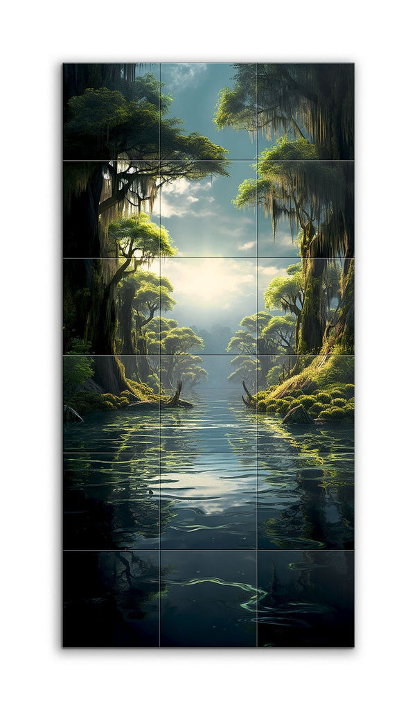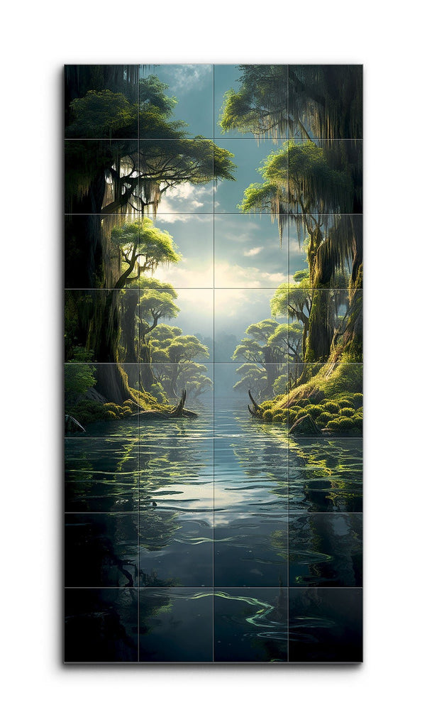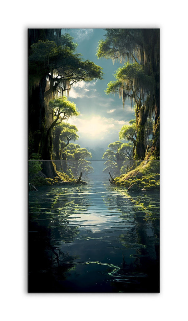 Das Kunstwerk fängt einen ruhigen und mystischen Wald mit einem stillen Wasserlauf im Herzen ein, der üppiges Grün widerspiegelt. Alte Bäume mit dichten Kronen bilden einen natürlichen Bogen über dem Wasser, geschmückt mit Moos und Ranken. Sonnenstrahlen filtern hindurch und werfen ein ätherisches Leuchten, das Tiefe und Realismus schafft. Die reiche Palette aus tiefen Grün- und Blautönen, kombiniert mit akribischen Details und einem Hauch von Fantasie, macht die Szene fast lebensecht und fesselnd.
