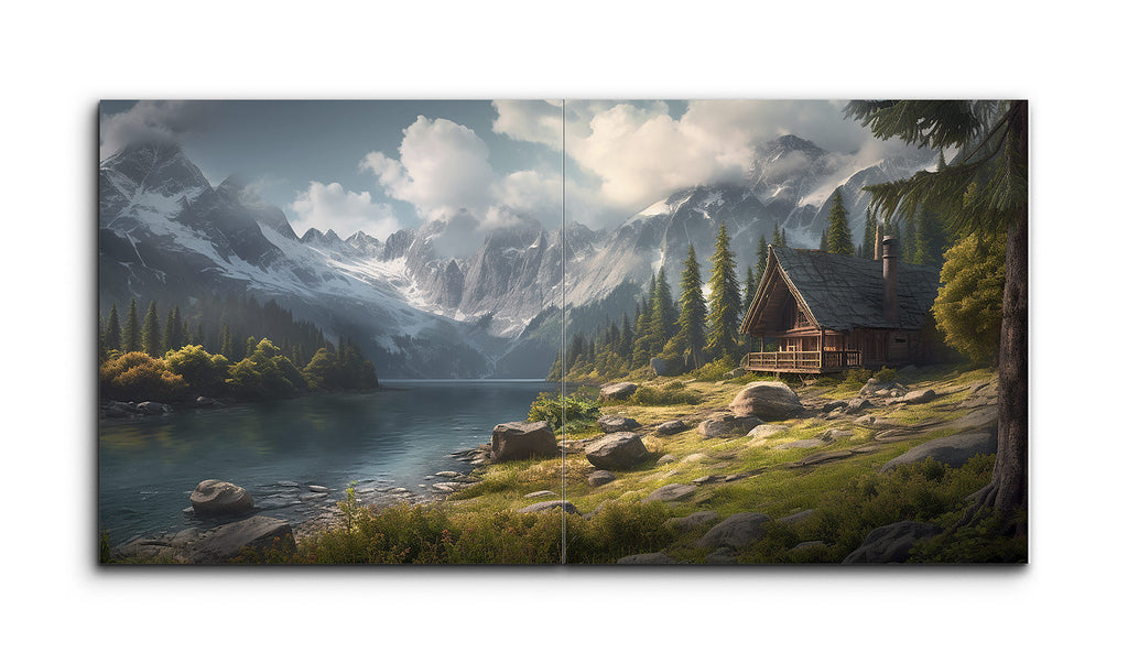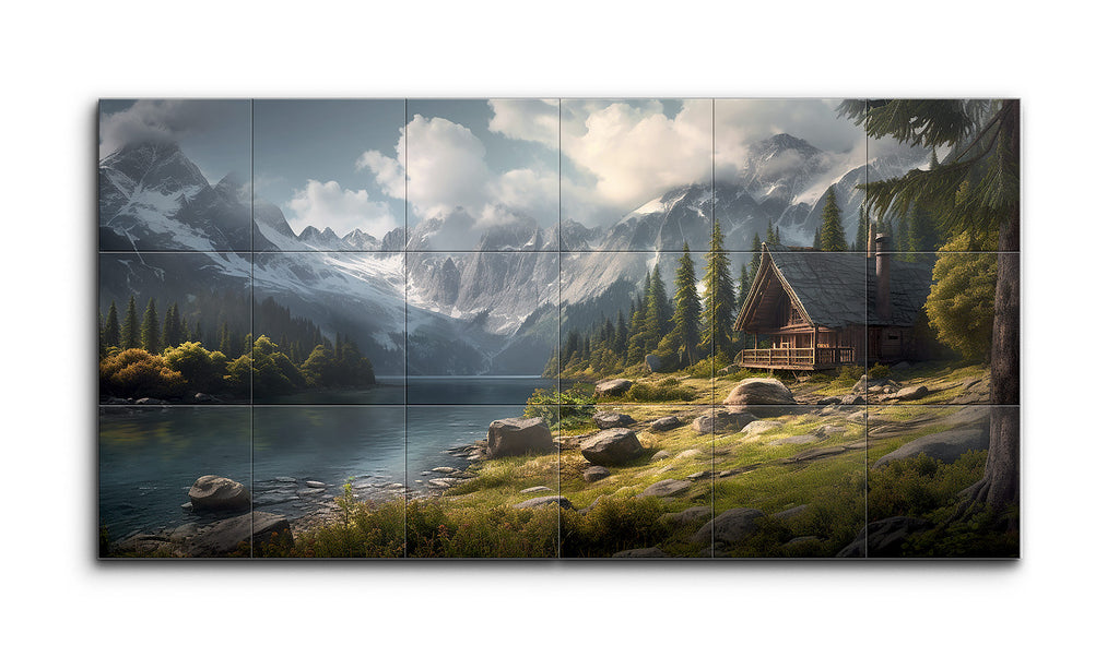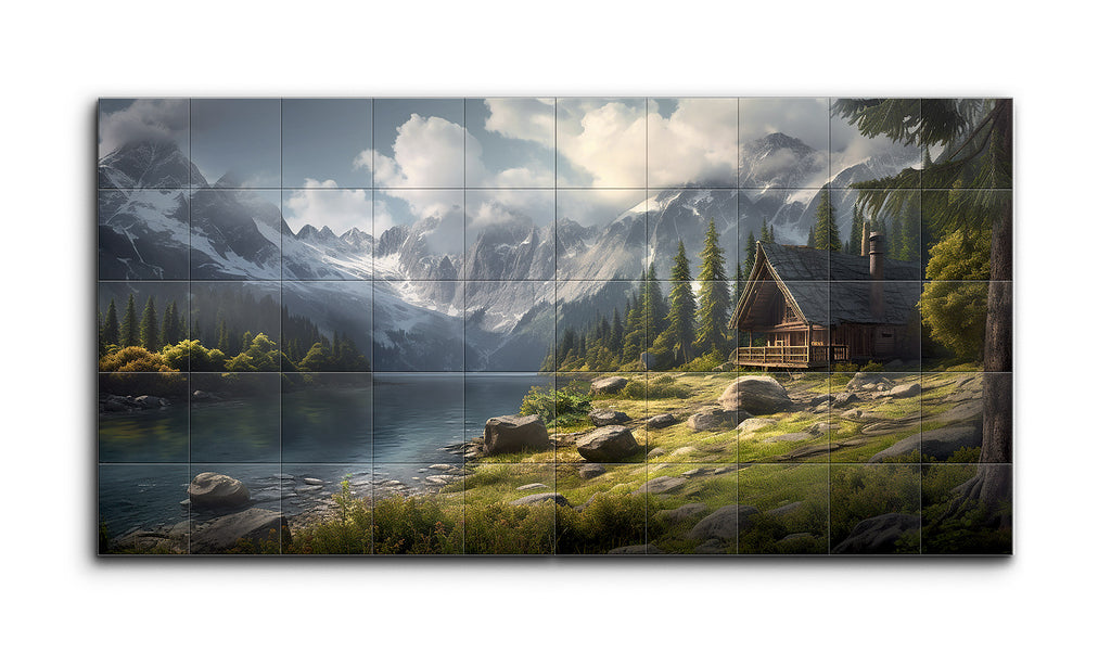 Dieses Fliesenbild zeigt eine ruhige Berglandschaft mit einer gemütlichen Holzhütte, die mit einem Steinkamin ausgestattet ist und sich zwischen üppigen immergrünen Bäumen befindet. Die Hütte steht auf grasigem, felsigem Gelände, das sanft zu einem ruhigen, spiegelnden See abfällt. Im Hintergrund erheben sich majestätisch schneebedeckte Berge, die teilweise von weichen Wolken verhüllt sind. Der hochrealistische Stil fängt komplexe Texturen und Beleuchtung ein und schafft eine warme und einladende Atmosphäre. Die ausgewogene Komposition und die detaillierten Naturelemente vermitteln Frieden und Einsamkeit.