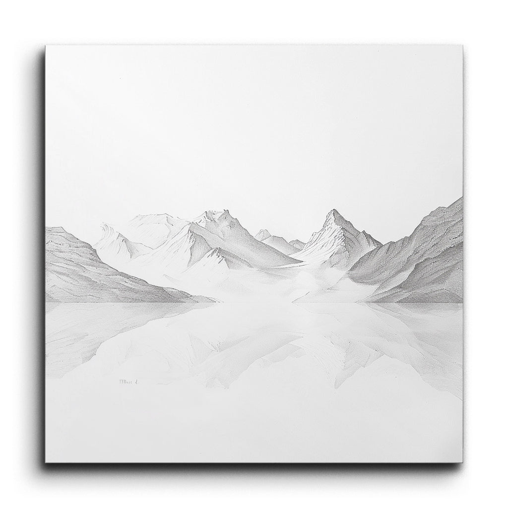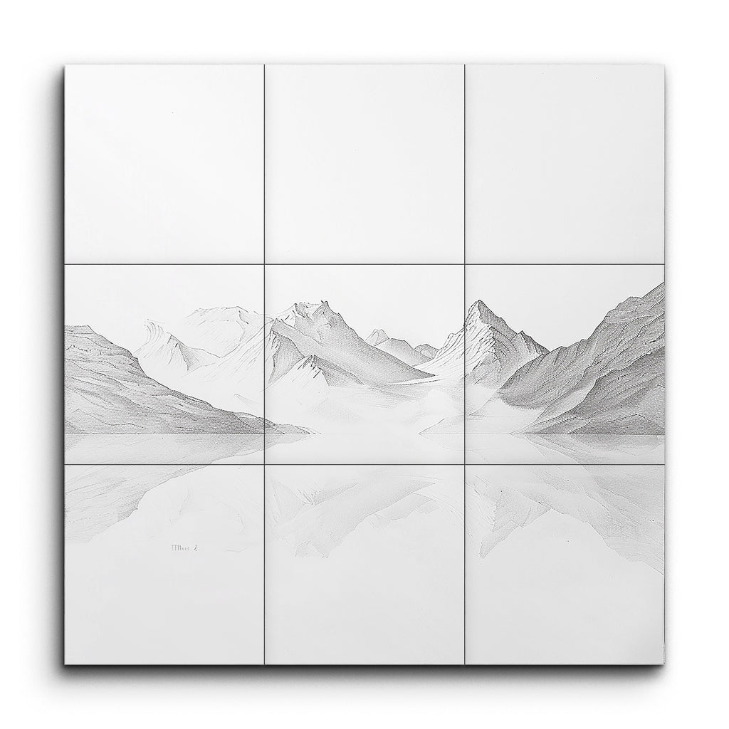 Tauchen Sie ein in die ruhige Schönheit einer bergigen Landschaft mit diesem atemberaubenden Fliesenbild. Das Kunstwerk, eine detaillierte Bleistiftzeichnung, fängt die zerklüfteten Gipfel mit feinen, zarten Linien und subtilen Schattierungen ein, die Tiefe und Dimension schaffen. Ein ruhiger Wasserkörper im Vordergrund spiegelt die majestätischen Berge wider und verstärkt die friedliche und reflektierende Stimmung. Dieses minimalistische, aber dennoch hochdetaillierte Stück betont die natürliche Schönheit und Stille der Szene und ruft ein Gefühl von Frieden und ätherischer Ruhe hervor.