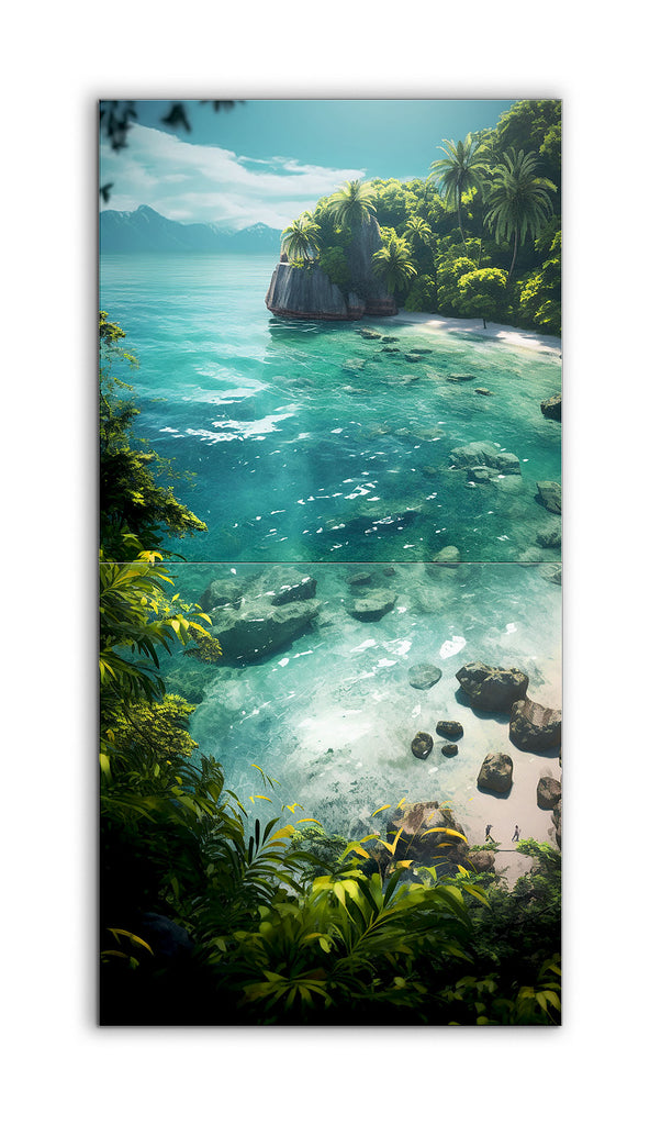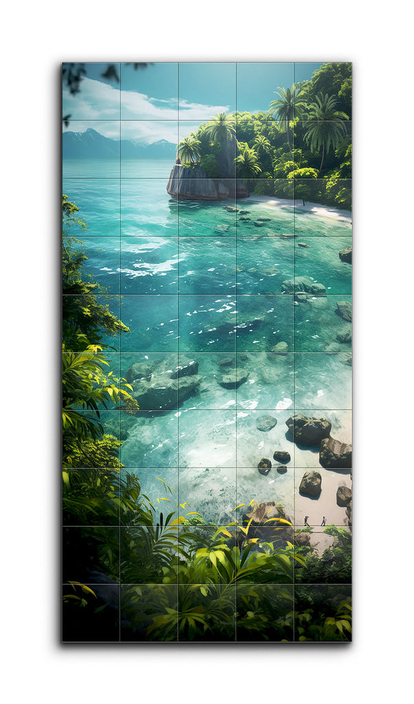 Dieses vertikal orientierte Fliesenbild fängt eine ruhige Küstenszene in einer üppigen, tropischen Umgebung ein. Der Vordergrund ist reich an detailliertem, lebendigem grünem Laub, das einen abgelegenen Strand einrahmt. Sandige Ufer, verstreute Felsen und klares türkisfarbenes Wasser dominieren den Mittelgrund, wobei schimmernde Lichteffekte die ruhige Atmosphäre verstärken. Eine felsige, mit Vegetation bedeckte Klippe erstreckt sich ins Meer und führt zu einer fernen nebeligen Bergkette. Der realistische Stil und die aufwendigen Details des Kunstwerks rufen das friedliche Wesen eines tropischen Paradieses hervor.