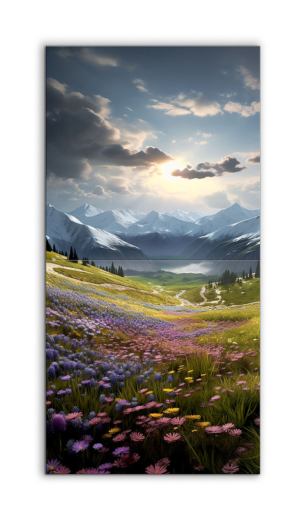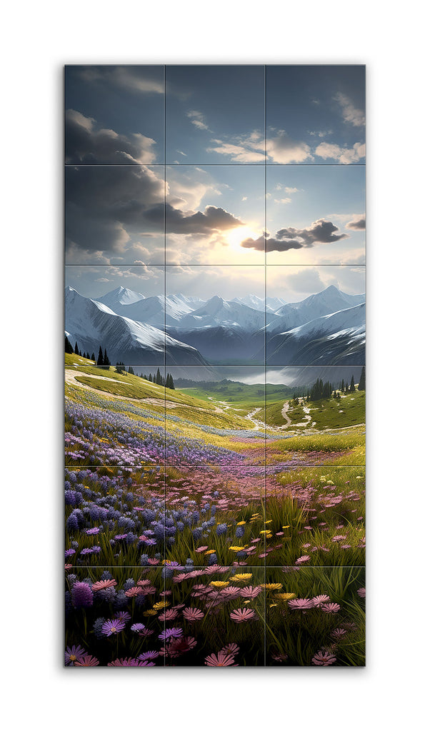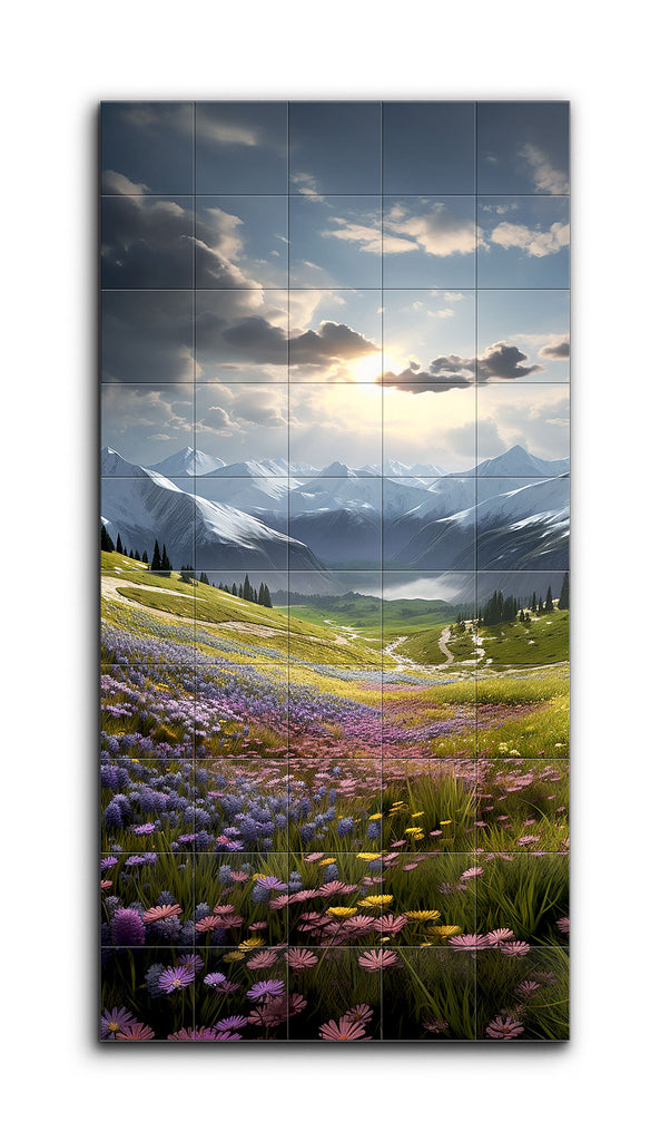 Dieses Fliesenbild fängt eine atemberaubende und ruhige Landschaft ein. Eine lebendige Wiese mit bunten Blumen—lila, pink und gelb—füllt den Vordergrund und schafft ein reiches Mosaik, das den Blick zu sanft geschwungenen grünen Hügeln lenkt. Ein gewundener Pfad oder Bach schlängelt sich durch die Hügel und führt zu majestätischen, schneebedeckten Bergen im Hintergrund. Der teils bewölkte Himmel, mit seiner Mischung aus dunklen und hellen Wolken, ist in das warme, goldene Licht entweder des Sonnenaufgangs oder Sonnenuntergangs getaucht, was der Szene dramatische Tiefe und Atmosphäre verleiht.