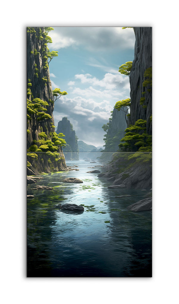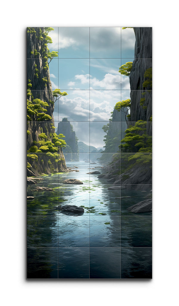Dieses Fliesenbild stellt eine ruhige Landschaft mit einem schmalen Fluss dar, der zwischen hoch aufragenden Klippen fließt. Die Klippen, geschmückt mit üppiger grüner Vegetation, zeigen verschiedene Grautöne und Brauntöne, die ihre raue Textur hervorheben. Das ruhige, spiegelnde Wasser fängt die Schönheit der umgebenden Natur und des strahlend blauen Himmels darüber ein. Der detaillierte, realistische Stil betont die natürlichen Elemente, mit gekonnter Nutzung von Licht und Schatten, wodurch Tiefe und eine friedliche, harmonische Atmosphäre entstehen, die den Blick des Betrachters zum fernen Horizont lenkt.