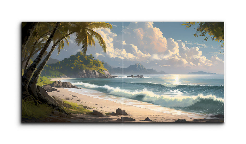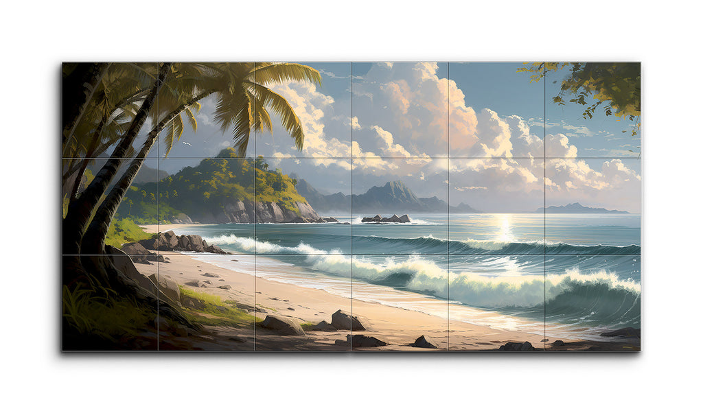 Dieses Fliesenwandbild fängt eine ruhige tropische Strandszene mit feinem, goldenem Sand im Vordergrund ein, der mit kleinen Felsen und Wellenabdrücken übersät ist. Das lebhafte blau-grüne Meer zeigt lebhafte Schaumkronen. Links neigen sich Palmen zum Ozean hin und werfen Schatten auf den Sand. Im Mittelgrund offenbart sich ein Strand, der aus dem Blickfeld verschwindet und zu einem üppigen, felsigen Vorsprung führt. Der Hintergrund zeigt einen ruhigen Ozean, der auf einen Himmel mit flauschigen Wolken trifft, die in warmes Sonnenlicht getaucht sind und eine friedliche, idyllische Flucht heraufbeschwören.