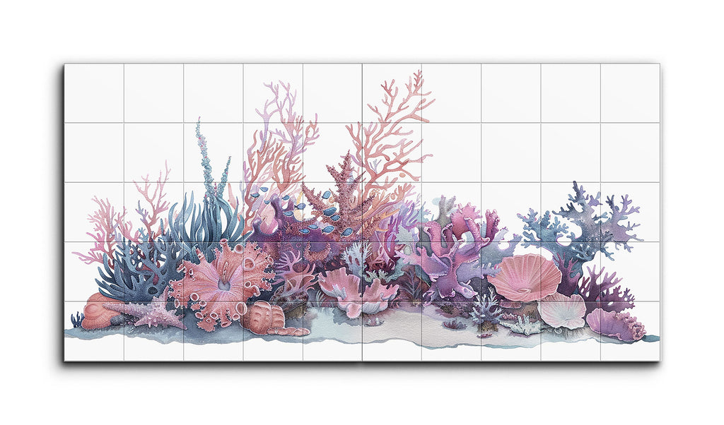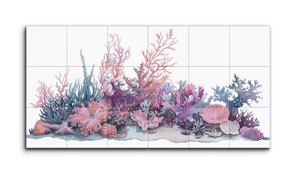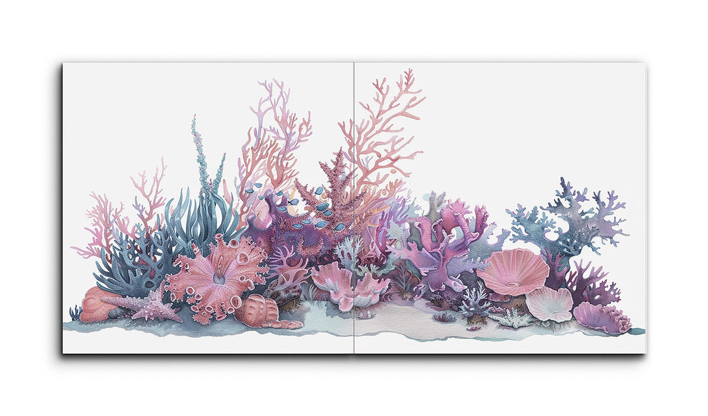 Dieses Diptychon-Fliesenbild zeigt eine wunderschön stilisierte Korallenriffszene, dargestellt in sanften Schattierungen von Rosa, Lila und Blau mit Anklängen von Creme und Pfirsich. Das detaillierte Design fängt eine reiche Biodiversität ein und zeigt verzweigte Korallen, Seefächer und Anemonen. Der fantastische Stil betont die Ästhetik mit sanften Farbverläufen und kunstvollen Details. Die dichte Komposition und die überlappenden Elemente schaffen Tiefe und Komplexität, die die Unterwasser-Ruhe und die zerbrechliche Schönheit von Korallenriffen hervorrufen.