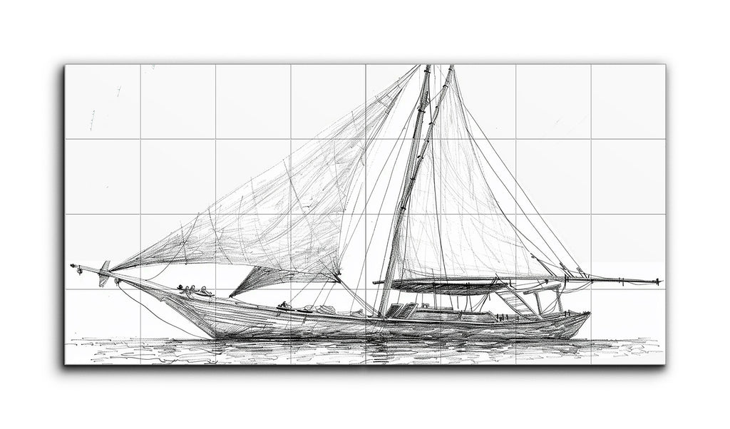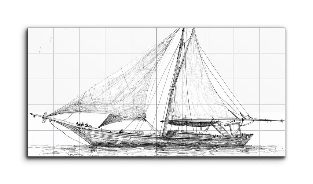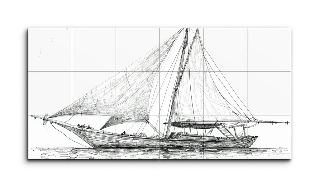 Dieses Fliesenbild zeigt eine akribisch detaillierte Skizze eines Segelboots, die in einem realistischen Stil mit feinen, präzisen Linien ausgeführt ist. Das auffällige Hauptsegel erstreckt sich vom Mast bis zum Bug, während ein kleineres Sekundärsegel in Richtung Heck positioniert ist. Der hölzerne Rumpf des Boots ist detailliert gezeichnet und zeigt seine Krümmung und Textur. Leichte horizontale Striche deuten auf ruhiges Wasser unter dem Boot hin. Monochrome Linienarbeit, die an technische Zeichnungen erinnert, betont Tiefe, Schatten und Textur und schafft eine ausgewogene und harmonische Komposition.