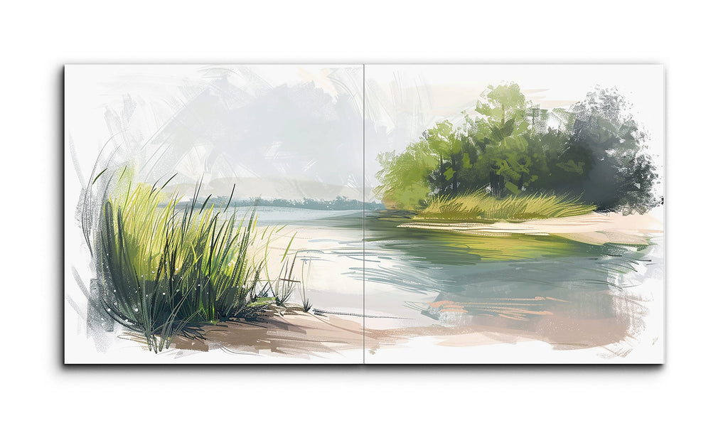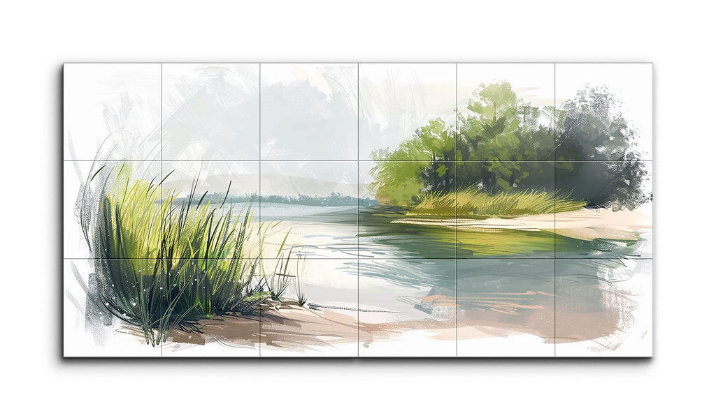Dieses Diptychon-Fliesenwandbild fängt eine ruhige Landschaft ein, wahrscheinlich an einem Flussufer oder Seeufer, in einem impressionistischen Stil. Breite, lockere Pinselstriche deuten natürliche Formen ohne präzise Abgrenzung an. Im Vordergrund stellen lebhafte grüne und gelbe Striche sonnenbeschienene Gräser dar. Weiche blaue und grüne horizontale Striche vermitteln ruhiges Wasser. Ein sandiges Ufer geht in einen vegetativen Mittelgrund über. Der Hintergrund zeigt eine kleine Insel mit schattigen Bäumen. Leichte Pinselstriche deuten den Himmel an und betonen die friedliche, kontemplative Szene.