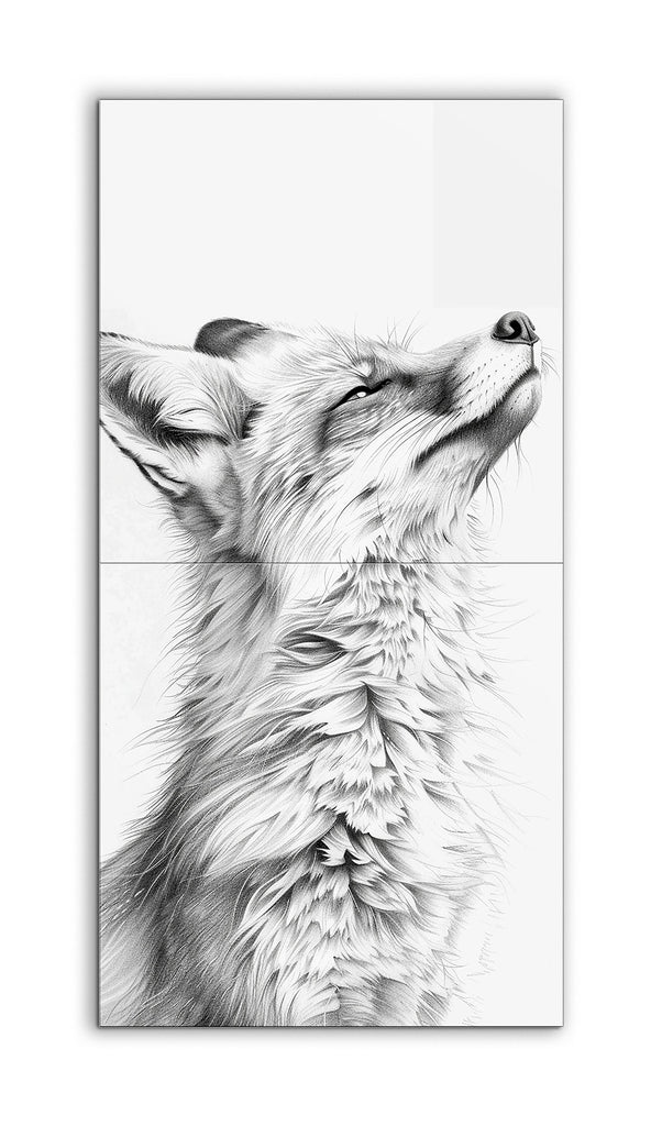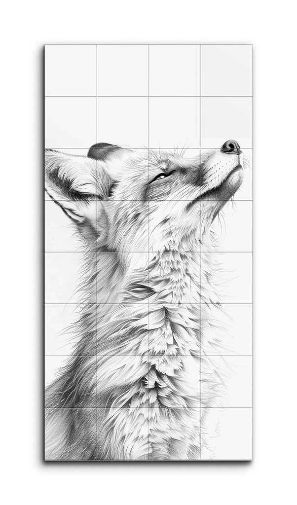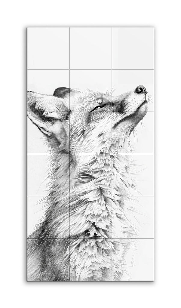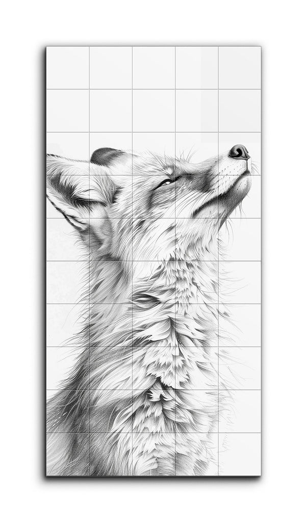 Dieses Fliesenbild zeigt eine hyperrealistische Zeichnung eines Fuchses im Profil, dessen Kopf sanft nach oben geneigt ist und Anmut und Gelassenheit ausstrahlt. Die akribische Aufmerksamkeit des Künstlers für Details wird in den feinen Linien deutlich, die die Textur und Weichheit des Fuchsfells einfangen. Durch geschicktes Schattieren werden die Konturen und die Tiefe seines Fells, seiner Ohren und Gesichtszüge hervorgehoben. Die geschlossenen Augen des Fuchses verstärken seinen friedlichen Ausdruck. In Schwarz-Weiß gehalten, besitzt das Kunstwerk eine zeitlose, klassische Anziehungskraft, die sich auf die filigranen Details und das subtile Zusammenspiel von Licht und Schatten konzentriert.
