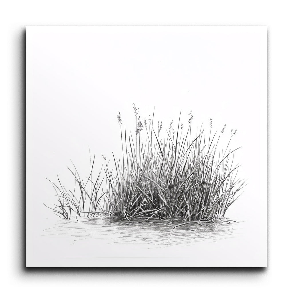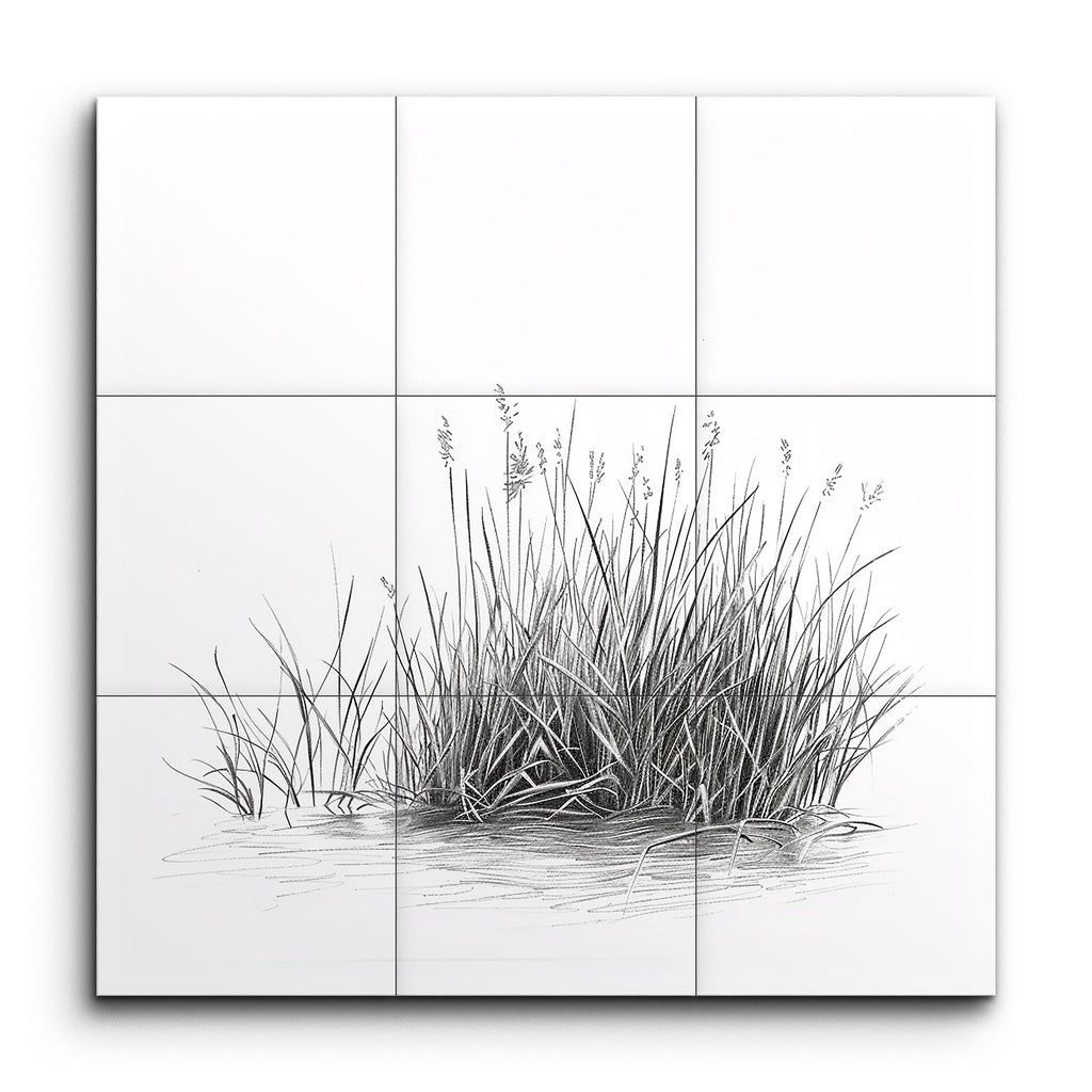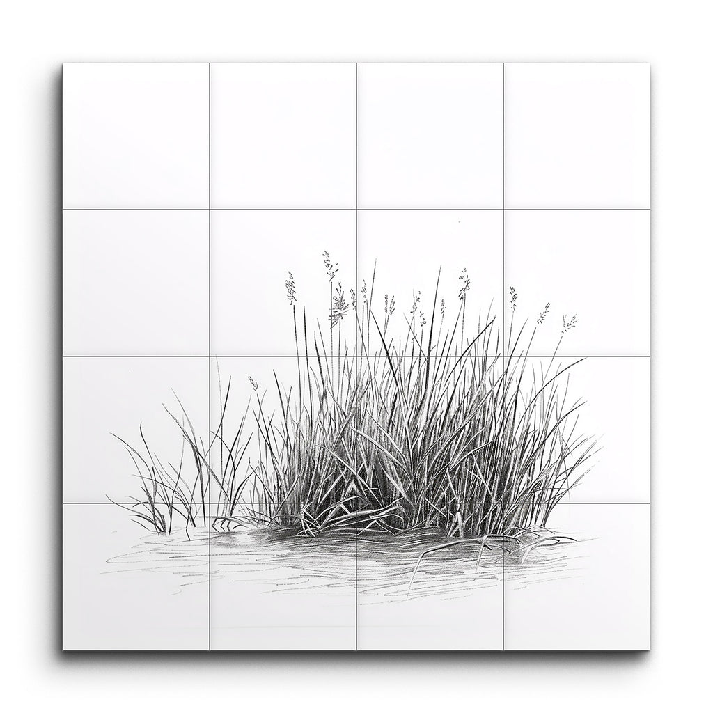 Dieses exquisite Fliesenbild zeigt eine minimalistische, monochromatische Darstellung eines dichten Grasbüschels, der mit feinen Linien und subtiler Schattierung Textur und Tiefe vermittelt. Die dünnen, zarten Grashalme variieren in Länge und Richtung und schaffen ein organisches, natürliches Gefühl, während die detaillierten Samenstände eine Prise Raffinesse hinzufügen. Die ruhige Komposition fängt die zurückhaltende Schönheit der Natur ein und hebt die oft übersehene Eleganz eines einfachen Grasbüschels hervor. Perfekt, um jedem Raum eine Note von Ruhe zu verleihen.