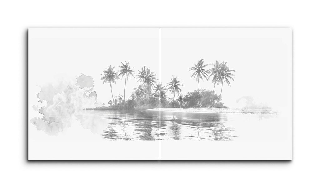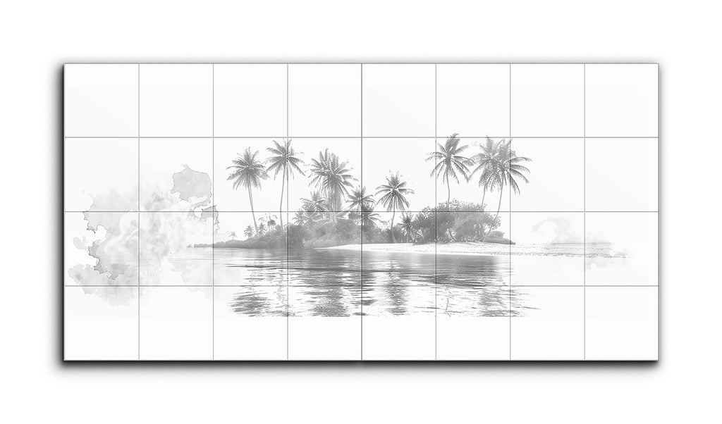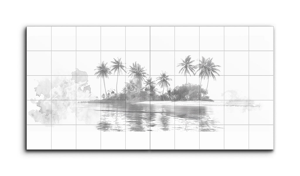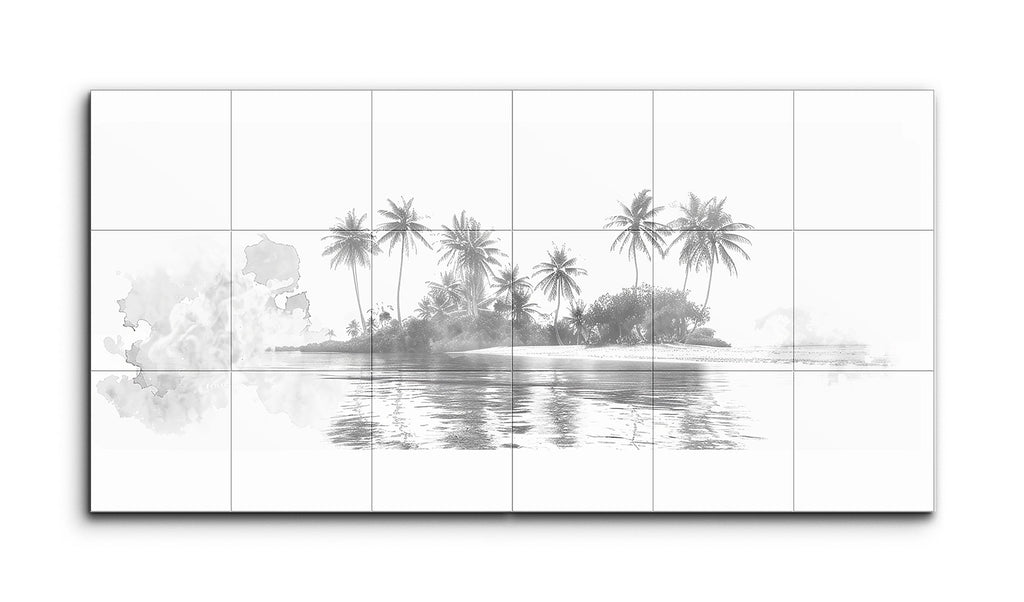 Dieses Fliesenbild zeigt eine friedliche Inselszene in Graustufen. Hohe, schlanke Palmen wiegen sich sanft, ihre Wedel fächern sich anmutig inmitten dichter, üppiger Vegetation aus. Das ruhige, spiegelnde Wasser reflektiert die Silhouette der Insel und die Palmen mit subtilen Wellen, was Realismus und Ruhe hinzufügt. Ein sanfter, aquarellartiger Spritzer auf der linken Seite fügt sich nahtlos in die Szene ein und balanciert scharfe Details mit weicher Abstraktion, wodurch eine ruhige, tropische Atmosphäre entsteht.