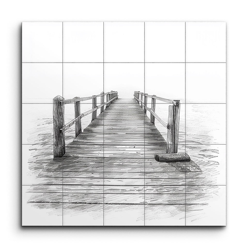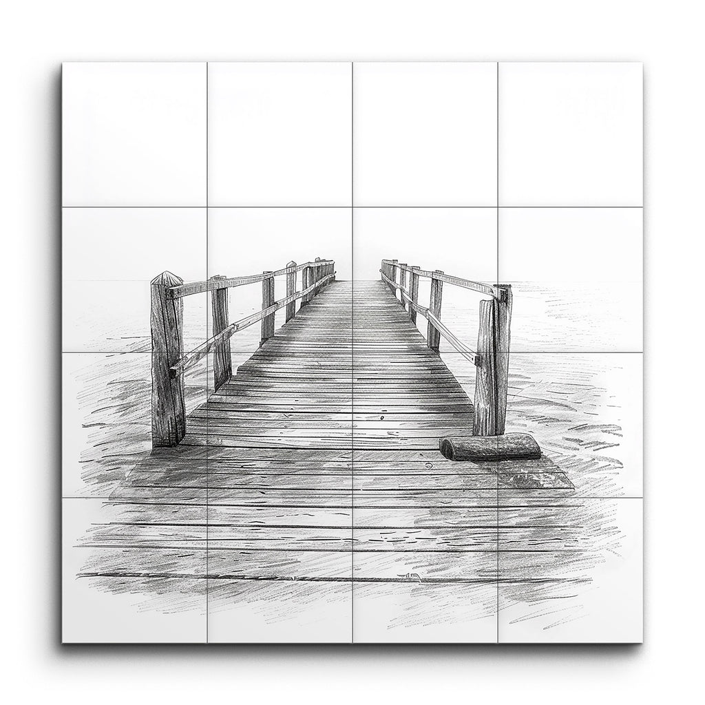 Verwandeln Sie Ihren Raum mit unserem faszinierenden Fliesenbild, das einen sorgfältig detaillierten Holzsteg zeigt, der sich in ein ruhiges Gewässer erstreckt. Die lebensechte Holzmaserung und die strukturierten Geländer ziehen den Blick zum Horizont und erzeugen ein Gefühl von Tiefe und Unendlichkeit. In einem äußerst realistischen Stil dargestellt, wecken die präzise Schattierung und Linienführung dieses Kunstwerks eine ruhige, besinnliche Stimmung, die perfekt geeignet ist, um in jedem Raum stille Reflexion zu fördern.