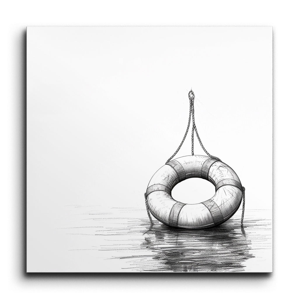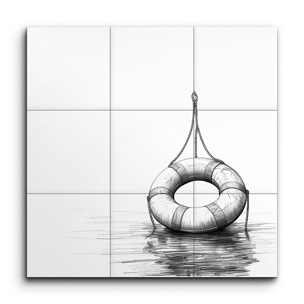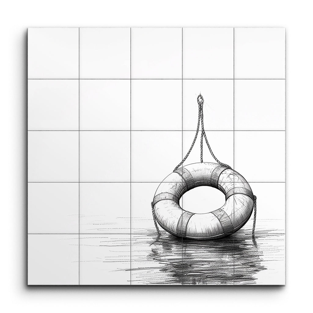 Fügen Sie Ihrem Raum einen Hauch von ruhiger Eleganz hinzu mit diesem faszinierenden Fliesenbild, das eine detaillierte Skizze eines auf dem Wasser treibenden Rettungsrings zeigt. Die sorgfältige Linienarbeit betont die kreisförmige Form und die strukturierte Oberfläche des Rettungsrings, während das befestigte Seil eine Verbindung zu etwas außerhalb des Rahmens andeutet. Der minimalistische, monochromatische Stil verwendet feine Linien und subtile Schattierungen, um eine reflektierende Wasseroberfläche zu schaffen, die den Schatten des Rettungsrings und sanfte Wellen einfängt und ein Gefühl von Ruhe und Einsamkeit hervorruft.