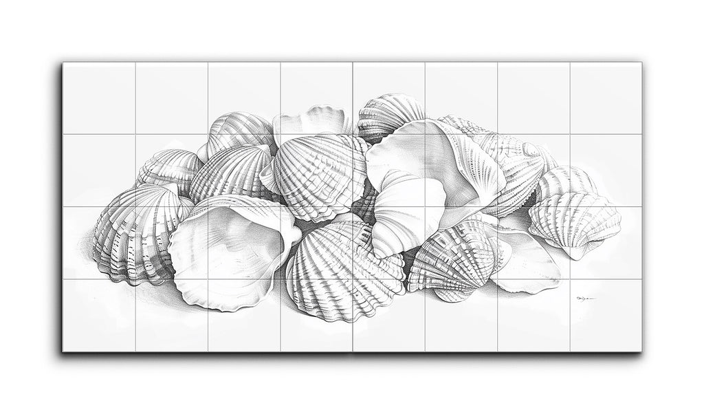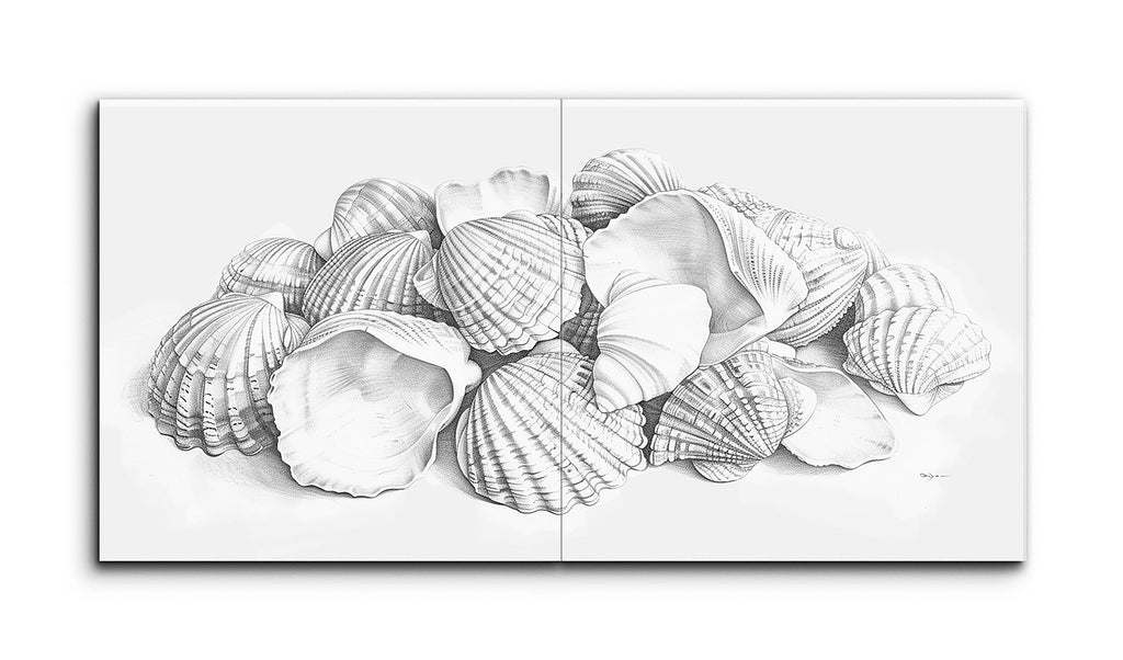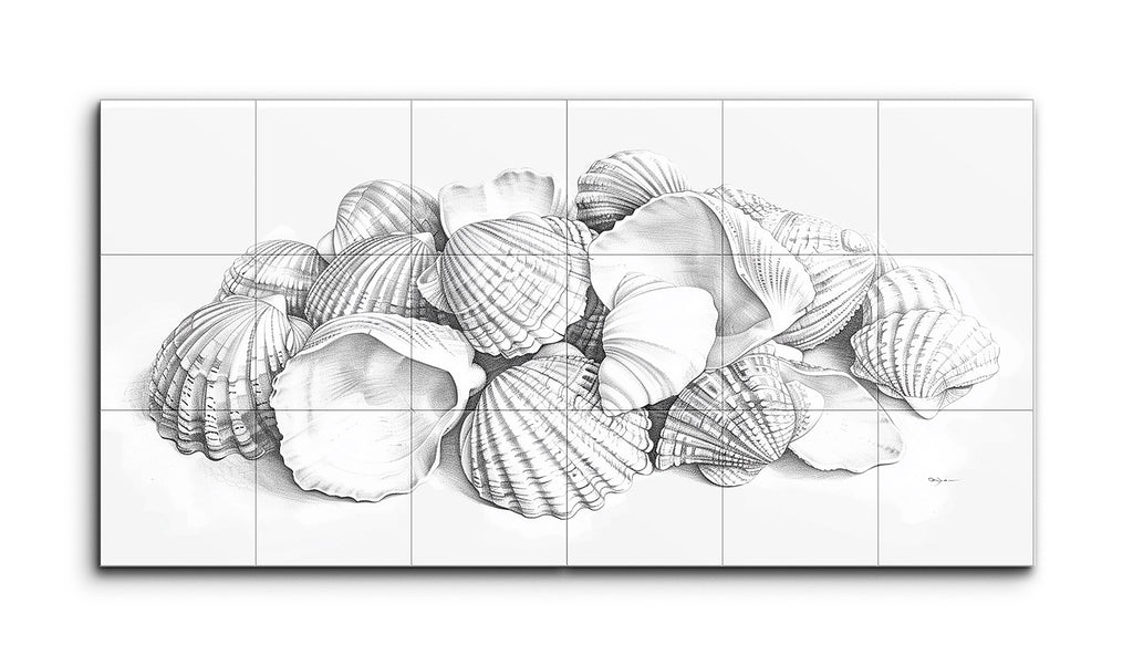 Dieses Fliesenbild fängt eine ruhige Sammlung von Muscheln in einer monochromen Diptychon-Komposition ein. Jede Muschel ist detailliert ausgearbeitet und zeigt eine Vielzahl von Mustern und Texturen, von gerippten Linien bis zu glatten Konturen. Der realistische Stil betont Präzision, mit sorgfältigen Schattierungen, die Tiefe und Dimensionalität schaffen. Die natürliche, scheinbar zufällige Anordnung der Muscheln lädt die Betrachter ein, das zarte Zusammenspiel von Licht und Schatten genau zu betrachten und die verfeinerte Schönheit jeder einzelnen Muschel hervorzuheben.